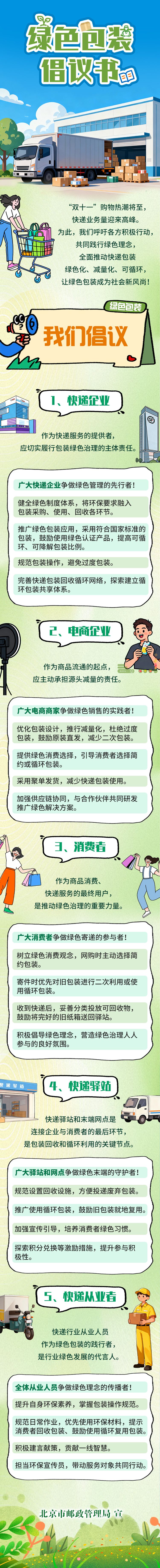 减少二次包装、采用聚单发货、循环利用旧包装……今年“双十一”,北京市邮政管理局向您发出倡议:包装循环瘦身,助力快递增绿!让我们从身边小事做起,助力“绿色包装”成为社会新风尚。