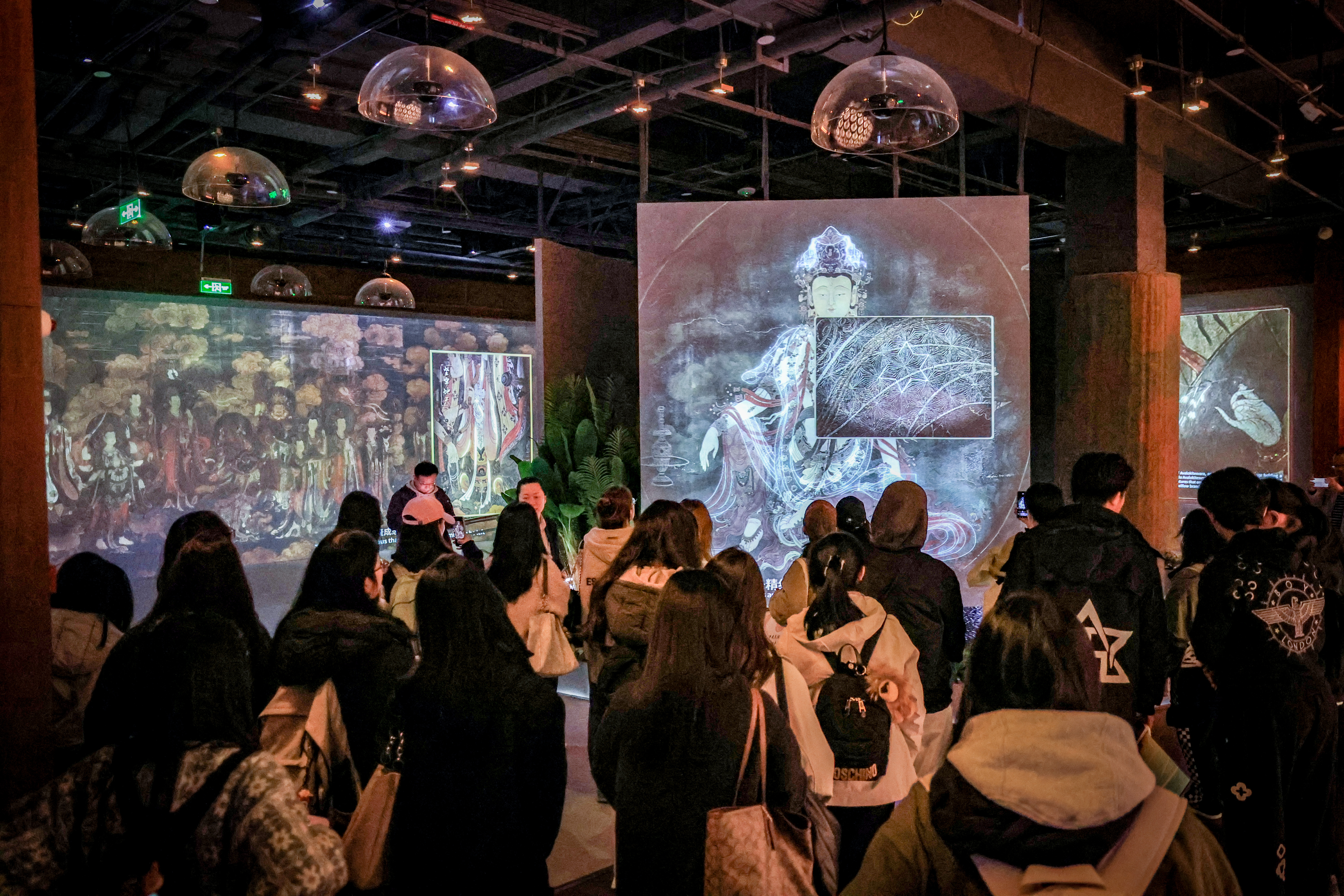 “这幅数字壁画还原了画中人物的法器,将画作放大到了极致,使得所持拂尘丝丝分明。这是在壁画现场打着灯光也很难发现的。”在法海寺壁画艺术馆中,通过数字化技术清晰呈现了法海寺中的精美壁画,穹幕影院中的光影秀更是让“沉睡”的壁画活了过来。跟随讲解员的介绍,同学们得以更加清楚地了解壁画中的人物故事和服饰文化,以及沥粉堆金的绘画技法,学习感受法海寺壁画的艺术价值、历史价值、文化价值、学术价值。