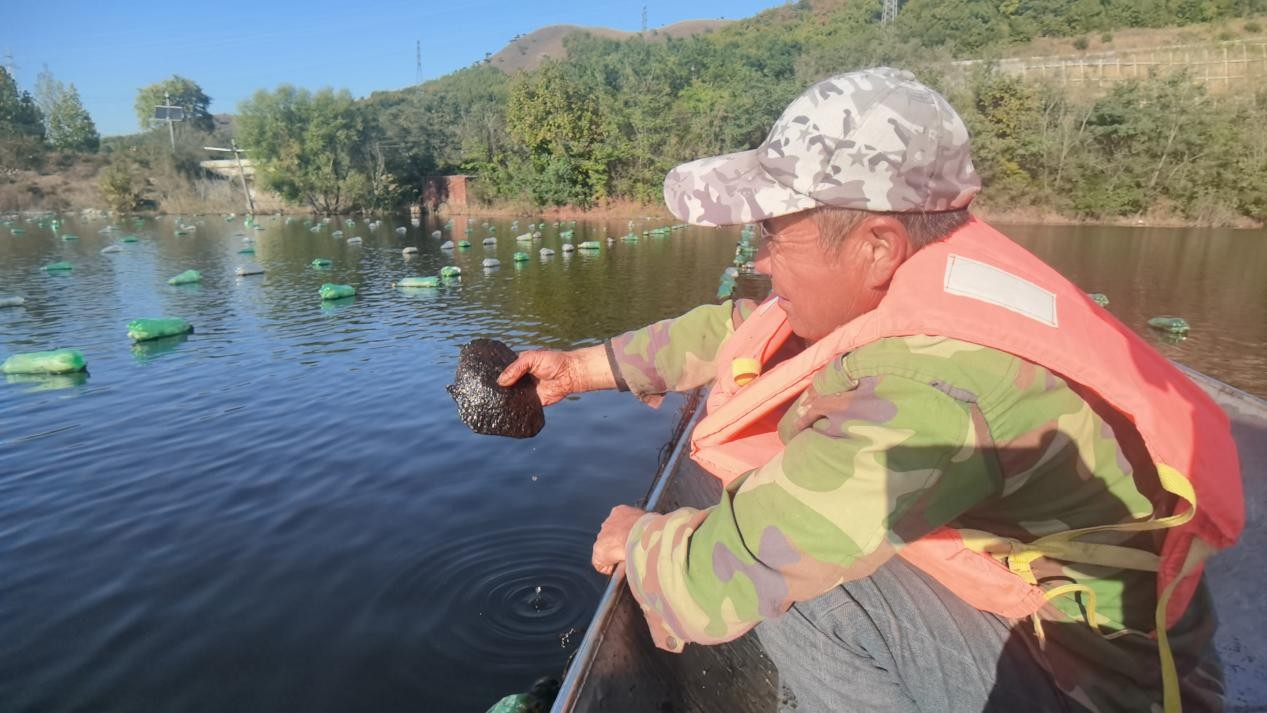2025年10月21日,秦皇岛卢龙县桃林营水库,白志富检查准备过冬的珍珠贝。新京报记者 寇家祥 摄