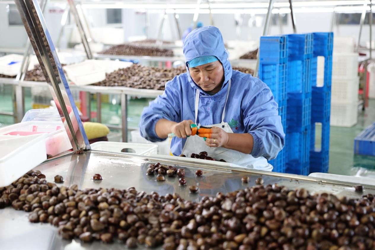 该企业中,3万平方米的生产车间,分割成不同的生产线。超过900位工人分散在各处,负责不同的工作,他们大部分来自周边的乡村,在这里月收入普遍超过四千元,其中给栗子开口的工人,最高收入可以达到八九千元。这是一个技术活儿,工人们用一把小弯刀,飞速地在坚硬的栗子壳上划开一道长长的口子,一粒开口的栗子就制成了。