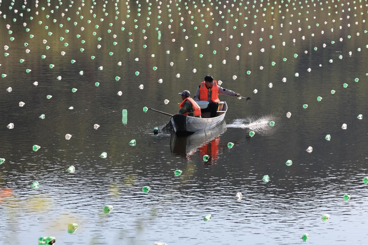 架起一叶铁皮舟,白志富船桨轻点岸边,小舟和人就驶进了一片碧波中。