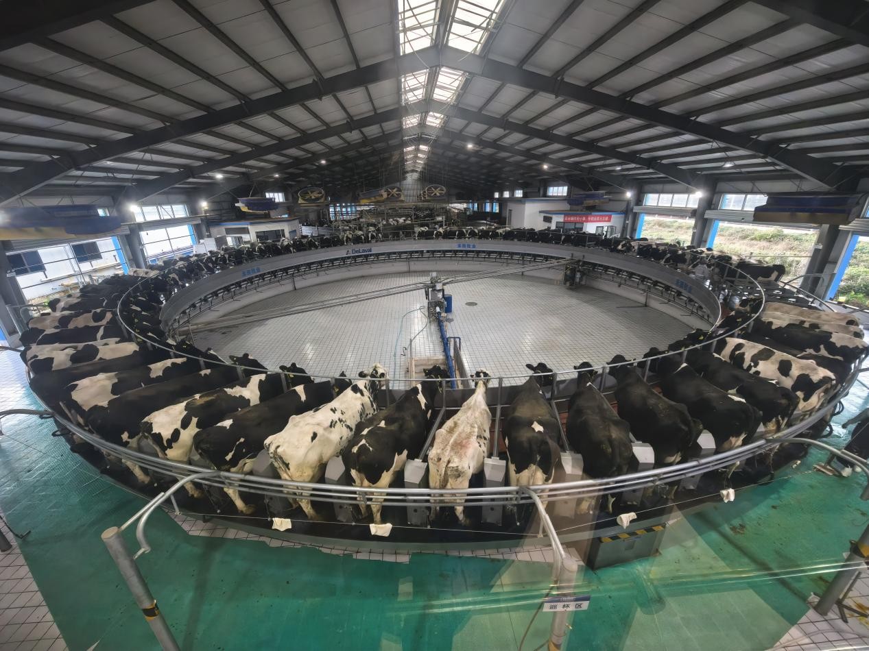 2025年10月20日,秦皇岛抚宁区一家乳品基地,自动挤奶的大转盘上,奶牛会自动进入转盘,转盘缓慢转一圈后,刚好完成一次挤奶。新京报记者 寇家祥 摄