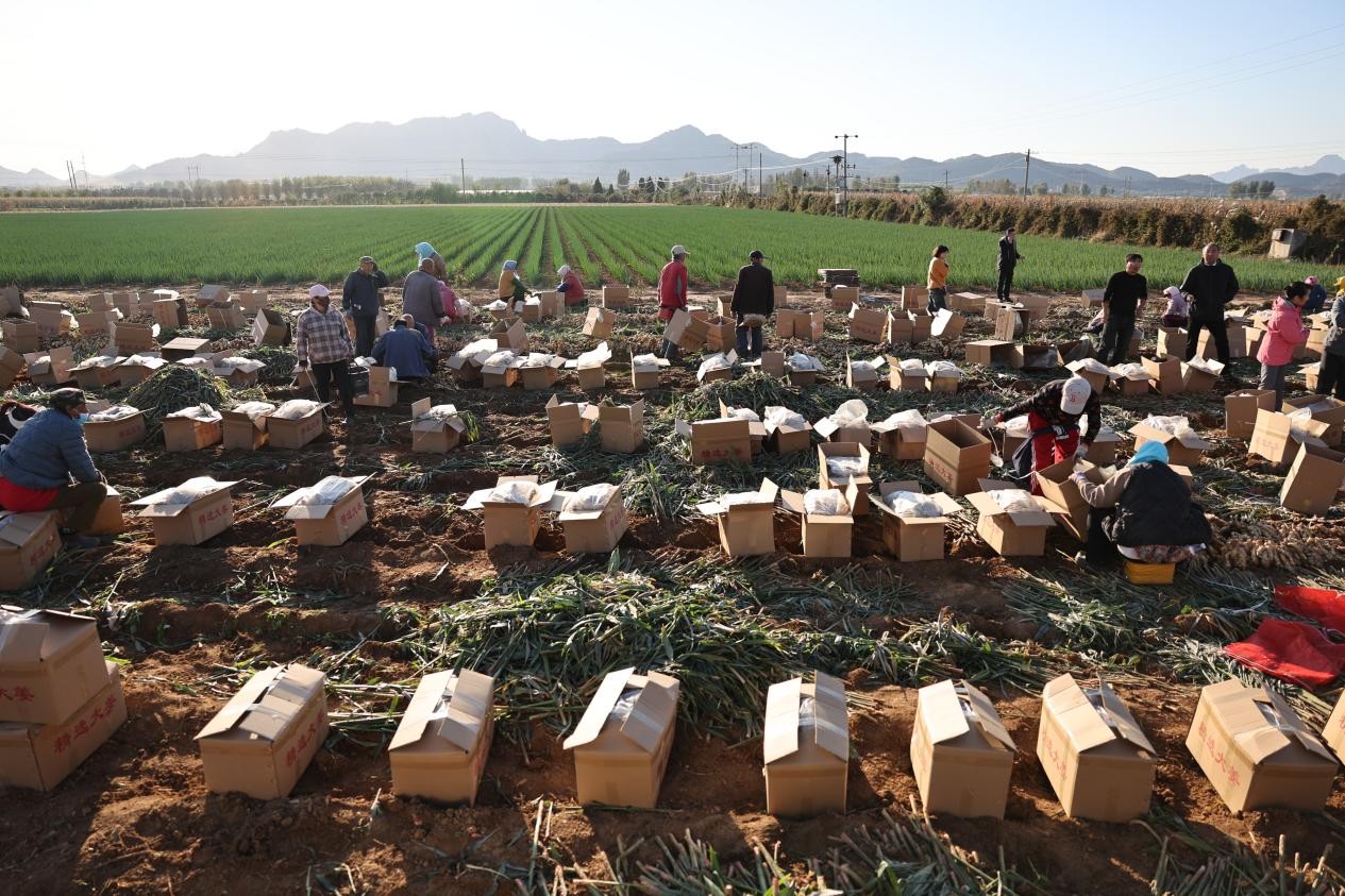 2025年10月21日,抚宁区潘官营村,上百位农民汇聚在一片生姜田中,正在忙碌地收生姜。人们割倒生姜的秧苗,挖出生长在土里的姜块,抖干净泥土,小心地装进纸箱中,生怕碰坏一处。