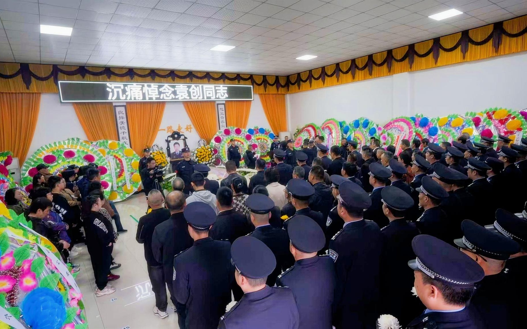 新京报讯(记者吴梦真 通讯员龚轩)11月1日,湖北省英山县殡仪馆内庄严肃穆,近500名干部群众、同事亲朋自发前来,送别因公牺牲的英山县公安局金家铺派出所所长袁创。新京报记者了解到,10月27日,袁创在派出所备勤室突发疾病,经抢救无效离世,年仅40岁。