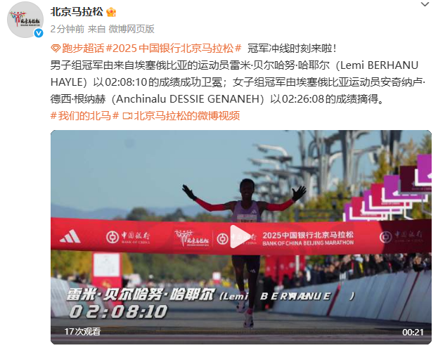 新京报讯 据北京马拉松微博消息,男子组冠军由来自埃塞俄比亚的运动员雷米·贝尔哈努·哈耶尔(Lemi BERHANU HAYLE)以02:08:10的成绩成功卫冕;女子组冠军由埃塞俄比亚运动员安奇纳卢·德西·根纳赫(Anchinalu DESSIE GENANEH)以02:26:08的成绩摘得。