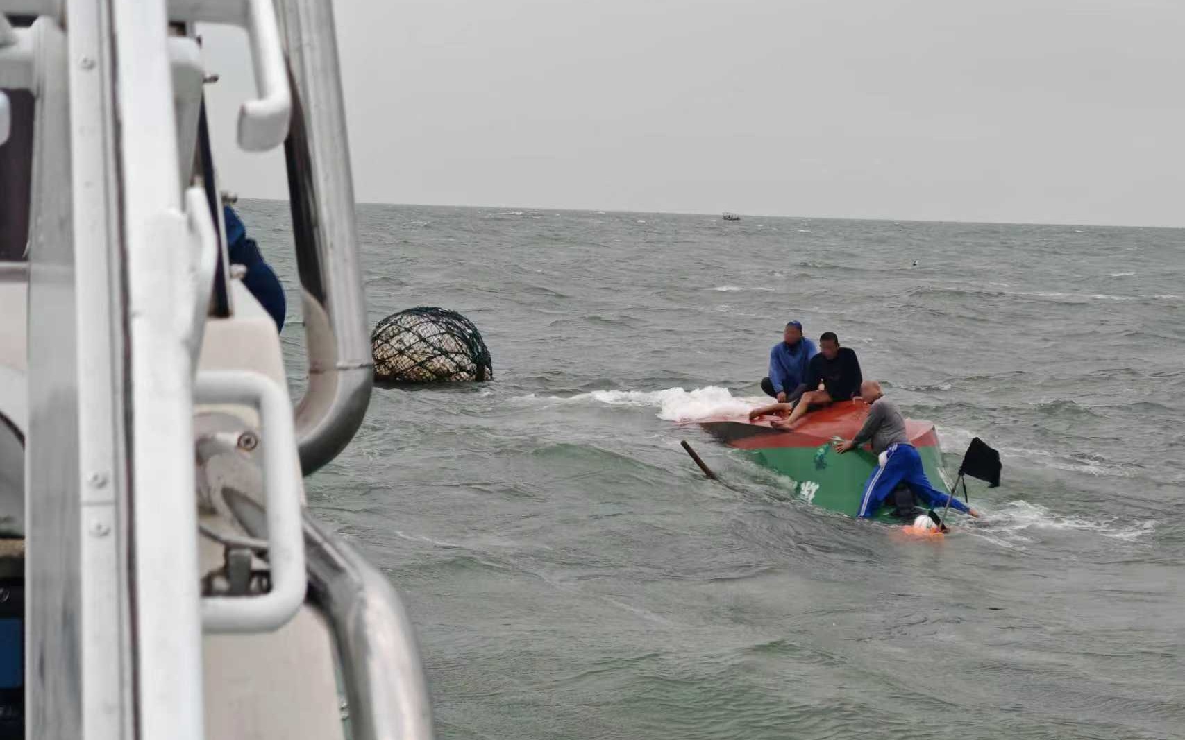 渔民的渔船在作业途中遭遇大风浪翻沉,海警局现场救援。受访者供图