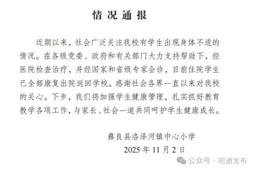 新京报讯 据昭通发布官微消息,11月2日,彝良县洛泽河镇中心小学发布情况通报,通报称学校有学生出现身体不适的情况,经医院检查治疗,目前住院学生已全部康复出院返回学校。