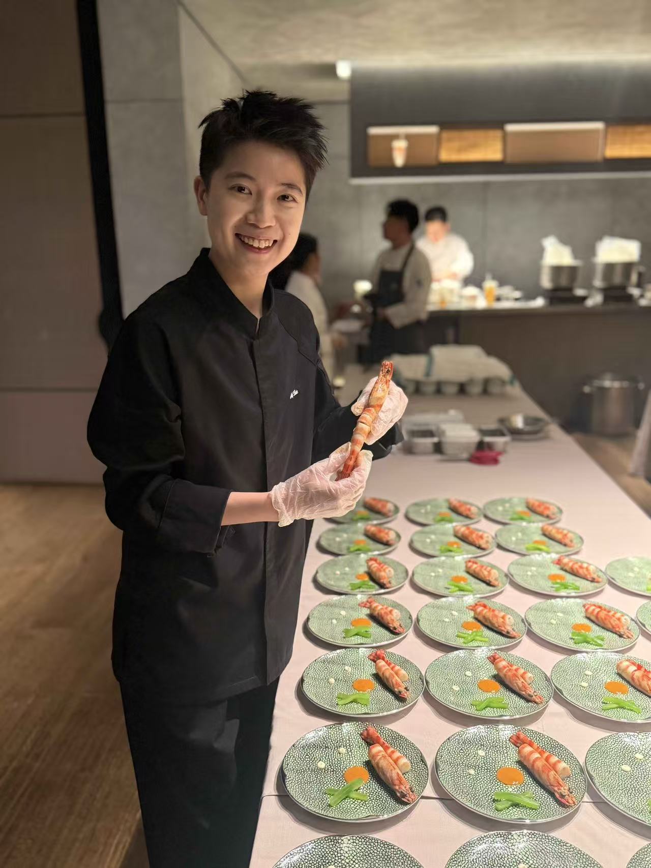 与食客们交流、合影后,屈雨瑜回到厨房,待冻僵的双手逐渐温热,又开始摆弄起餐品,她眼神落在盘底,手微微一挤酱汁瓶,蛋黄色的虾酱就恰到好处地滴在每一碟盘子的正中央,散开呈圆形状,她的胳膊快速摆动,精准如机械臂。