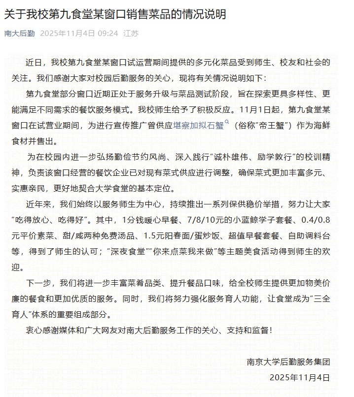 南京大学食堂供应“999元帝王蟹”?校方回应