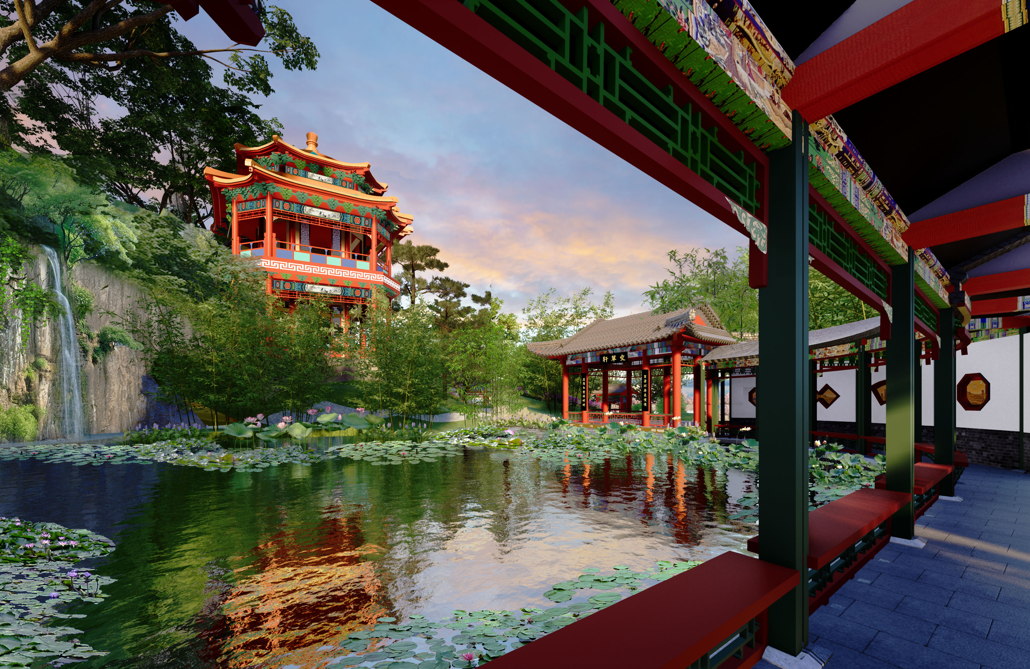 温州北京园效果图:崖壁垂泉与环翠廊。