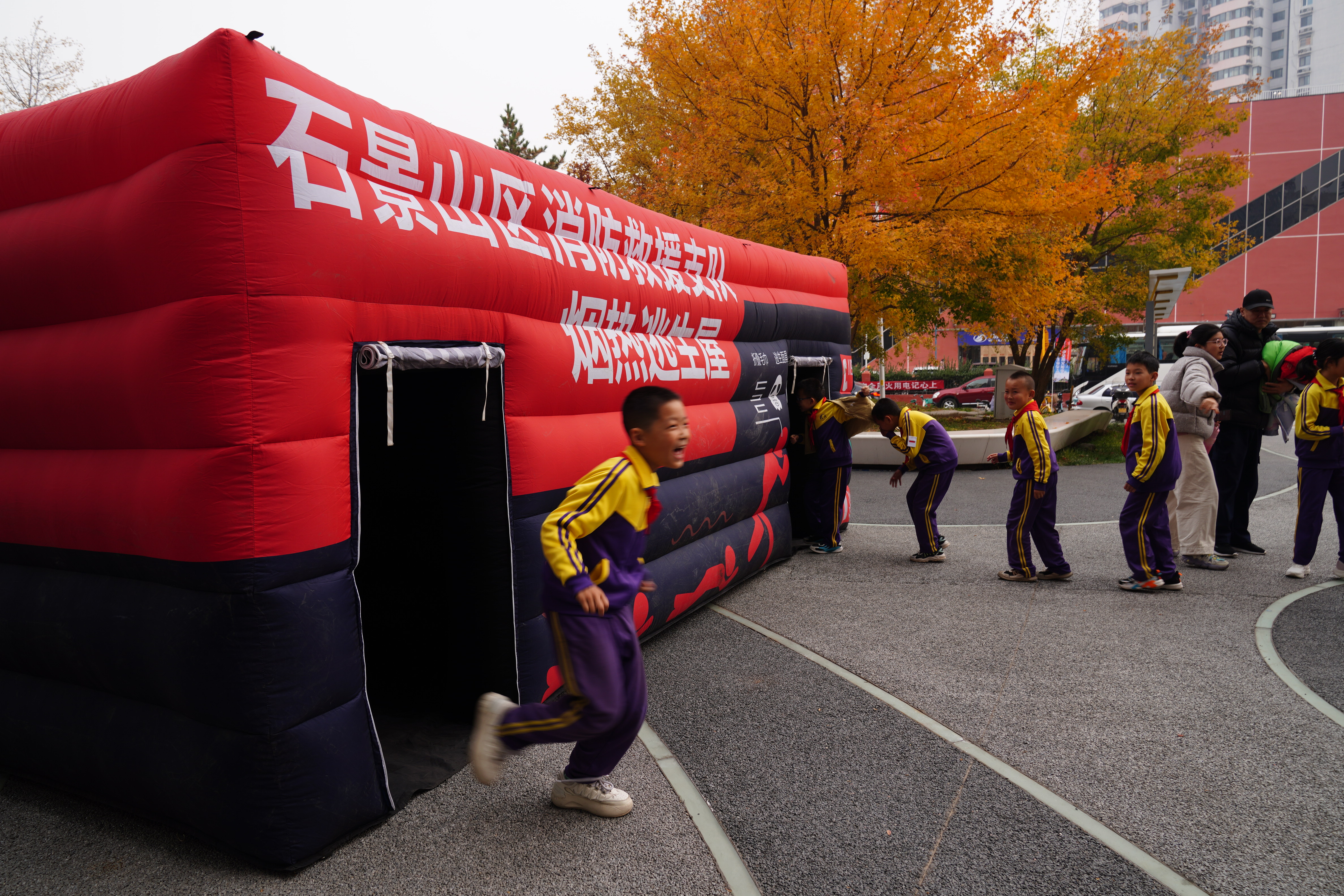 小学生在体验逃生帐篷。石景山消防供图