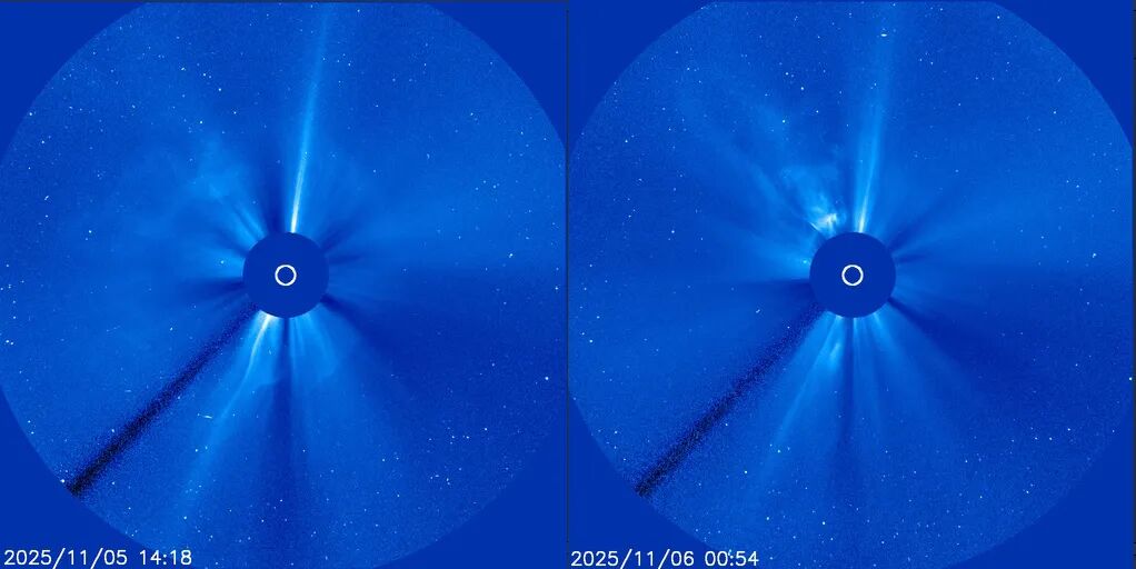新京报讯 据国家空间天气监测预警中心消息,北京时间11月5日晚间19时19分以及11月6日的清晨06时07分,太阳再次耀斑两连暴,最大强度分别为M7.4和M8.6级,并伴随较为明显的日冕物质抛射(CME)。