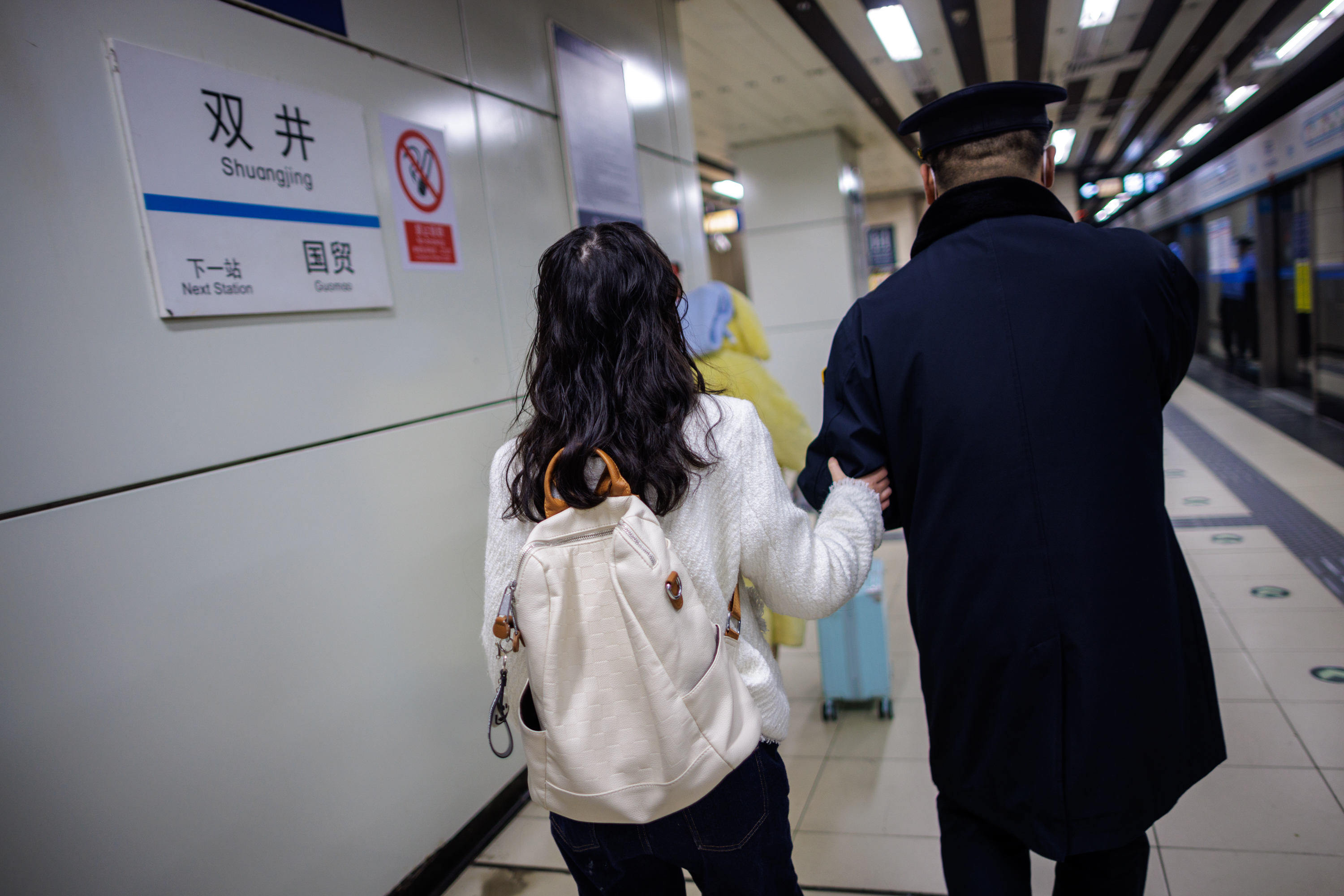 丸子进入地铁时受到了保安的帮助。