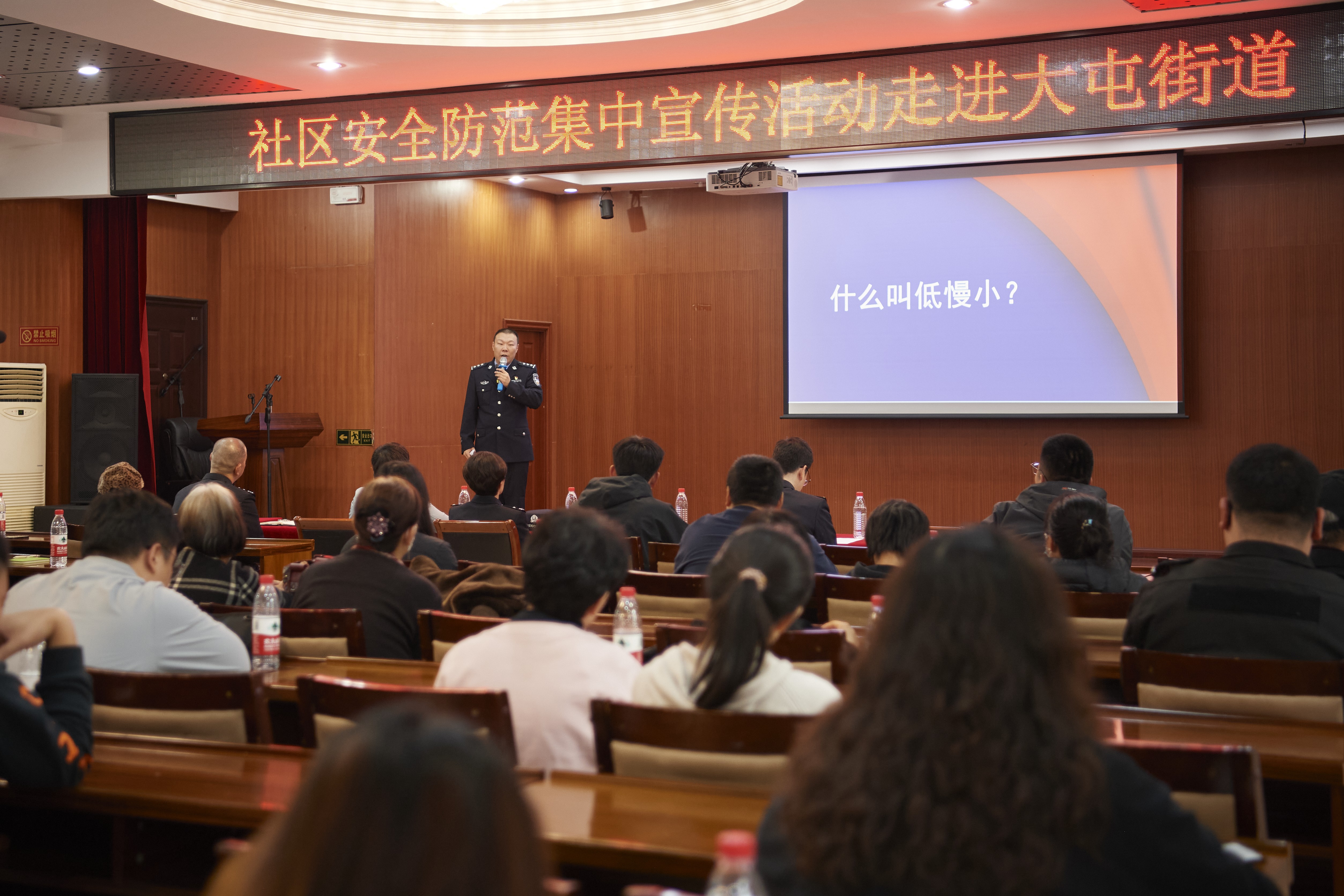 主会场活动现场,来自市公安局人口基层总队以及朝阳分局的业务骨干组成的宣讲团队,紧扣社区安全防范开展专题宣讲。人口基层总队围绕入室盗窃案件防范及群防群治力量组织发动进行宣讲;朝阳分局刑侦支队以案说法、以案释法,揭露新发多发电信网络诈骗犯罪手段及防范技巧;朝阳分局治安支队讲解无人机安全管理及养犬管理相关规定;朝阳分局大屯派出所所长通报了辖区治安形势,并围绕安全防范、矛盾纠纷等方面进行提示。