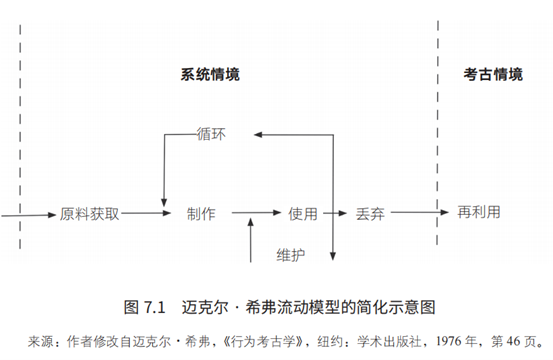 行为考古学家通常更关注文化内部的行为。他们的目标是发现人类行为的规律,而这些规律会在考古遗存中得以显现。人工制品制造和使用的时代背景称为“系统情境”(systemic context,人工制品所处的社会文化系统),而人工制品被丢弃及最终被发现的空间背景称为“考古学情境”(archaeological context)。在系统情境(物品的制作与使用时)和考古学情境之间,人工制品的不同形式是由“转变”造成的。如下图所示: