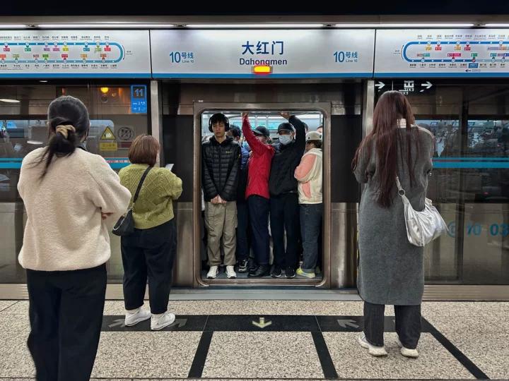 地铁10号线大红门站迎来客流高峰,几名上不去车的乘客在等候下一趟列车。新京报记者 王贵彬 摄