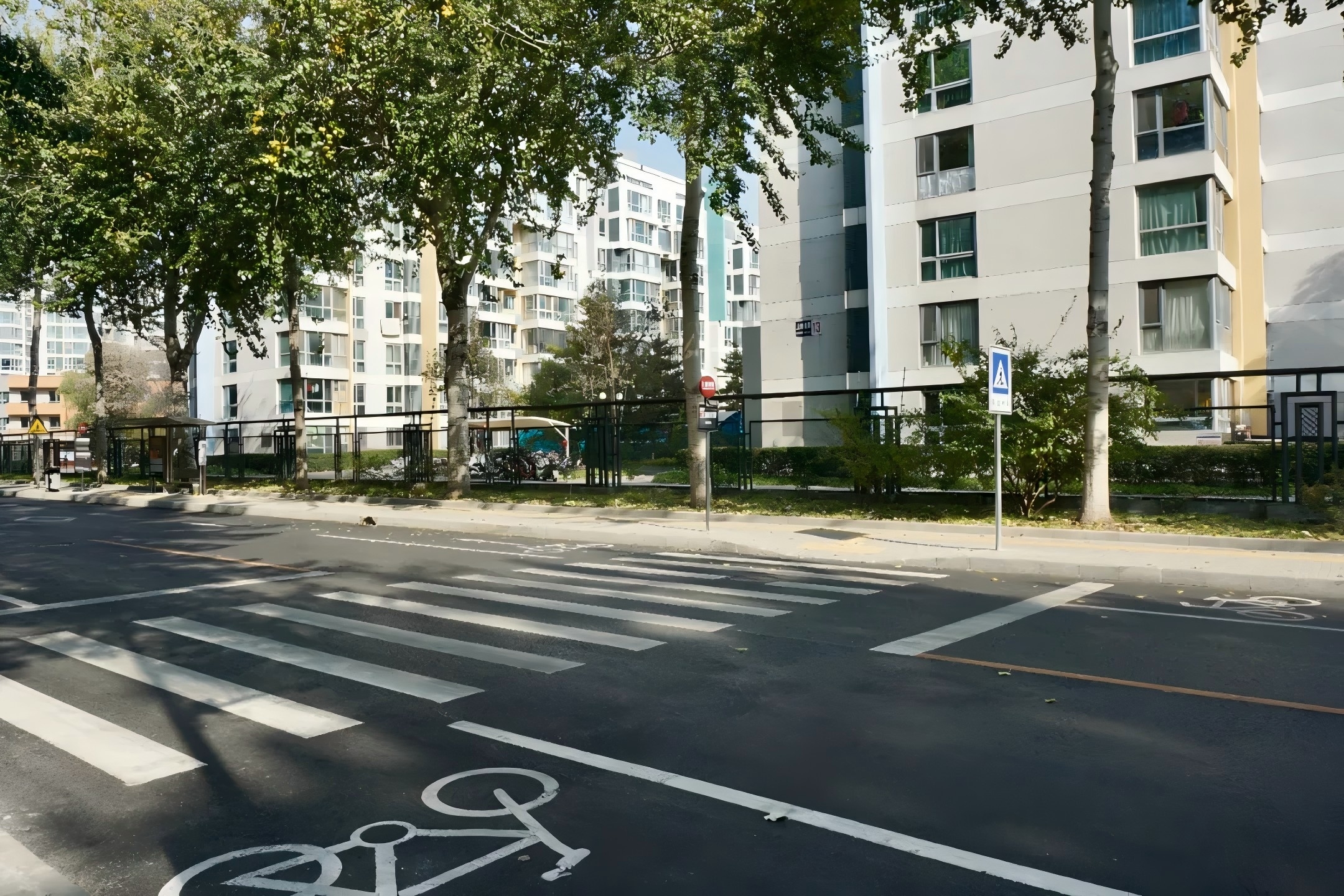 同时,本次大修工程对慢行系统与交通安全设施进行了精细化改造。在慢行系统方面,工程不仅重新铺设了人行步道,更换路缘石,更对沿线公交站台进行了无障碍设施改造,优化了市民的步行与候车体验。在交通安全方面,全线更新了交通标识系统,重新施划了清晰醒目的人行横道线,并增设了必要的交通安全提示牌,进一步强化了道路交通警示与引导功能,保障行人及车辆通行安全。