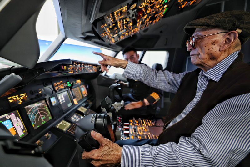 11月10日,一位90岁的“两航起义”亲历者在模拟驾驶舱里亲手“操控”飞机。1949年11月9日,原中国航空公司、中央航空公司的2000余名爱国员工,在中国共产党的领导下发动“两航起义”,12架飞机由香港北飞至北京、天津。毛泽东主席赞誉此举为“一个有重大意义的爱国举动”,周恩来总理称其为“中国人民民航事业的起点”。