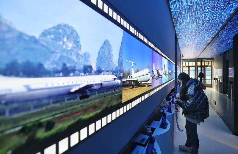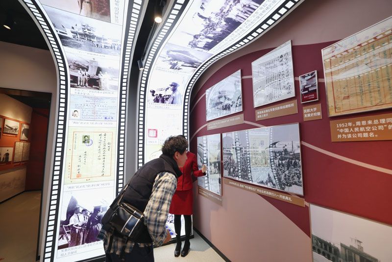 展馆由中航集团历时4年打造,严格遵循“修旧如旧”的文物保护原则,在646.16平方米的展陈空间及16434.5平方米的室外广场中,构建起主展馆、机舱体验馆、特藏品展馆联动的红色教育体系。图为在中国民航服役过的飞机照片。