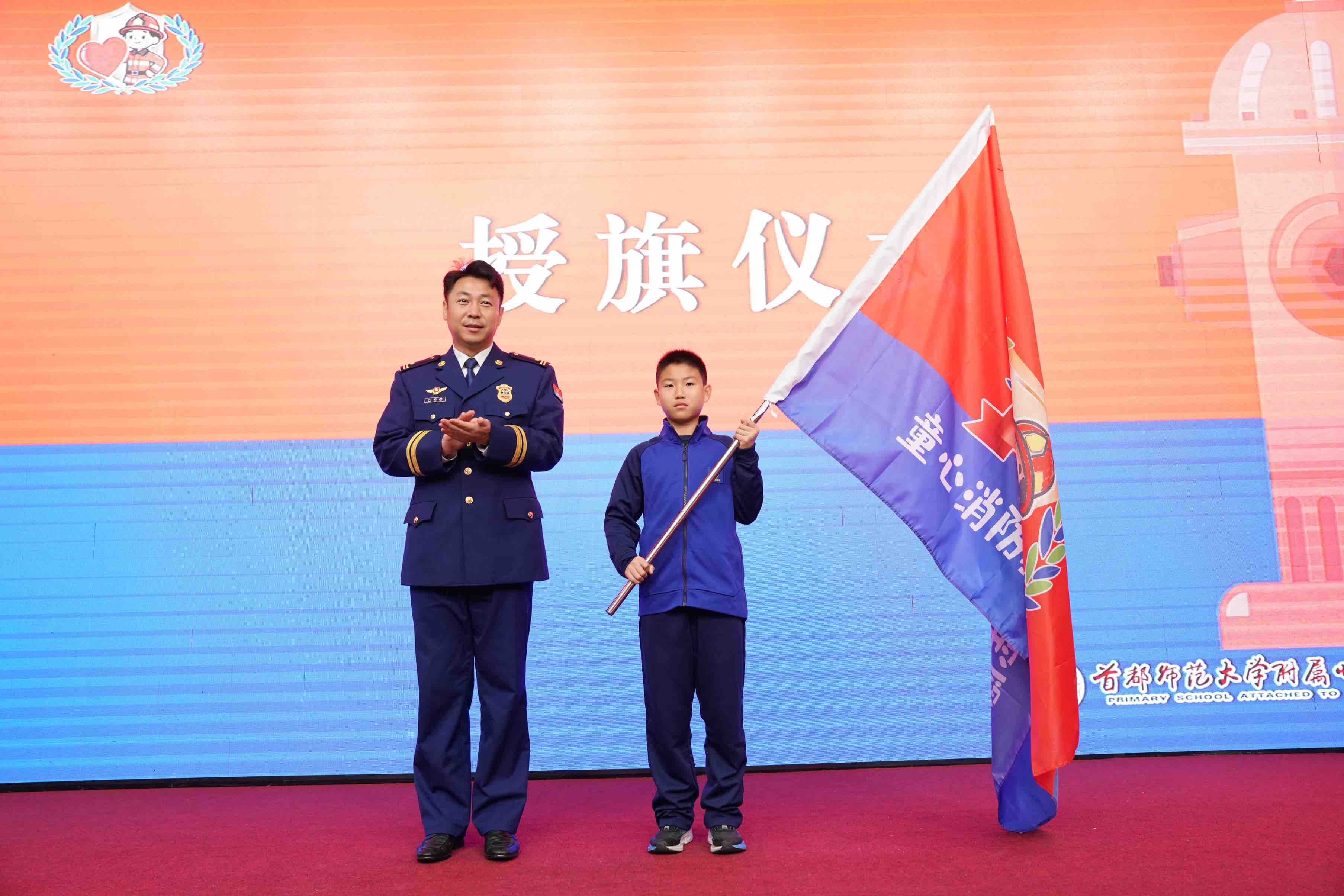 海淀区消防救援局副局长王兆堃将“童心消防救援志愿队”队旗授予学生代表。海淀消防供图