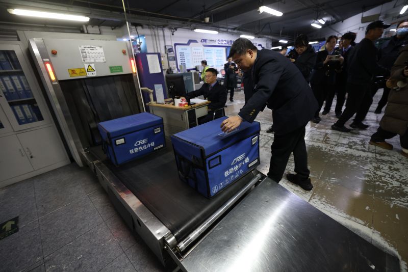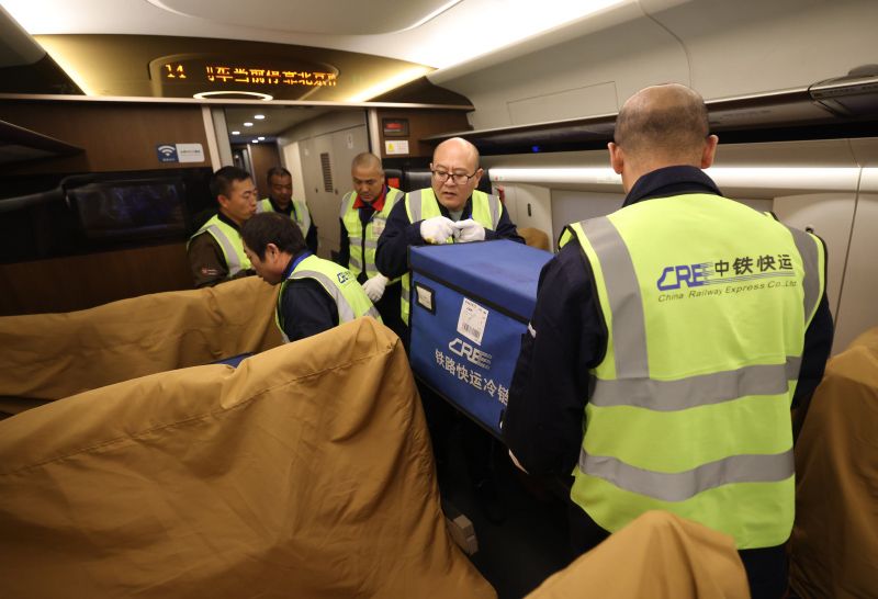 工作人员搬运高铁快件。某医学检验公司经理陈瑞浦向记者介绍,公司每月需将医学检测样本从北京发往全国各地,中铁快运提供的高铁急送、专人送、冷链运输服务,满足了样本“当日达”“小时达”的物流需求。