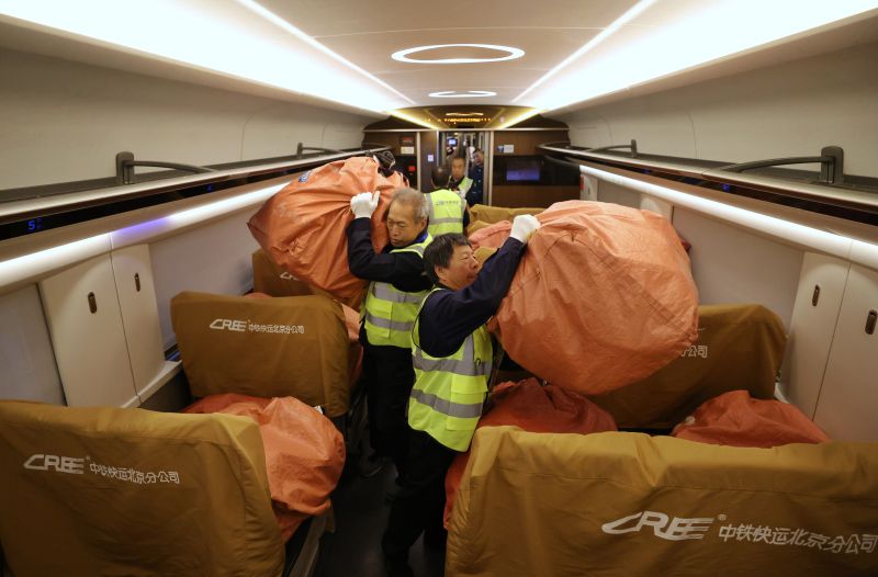 高铁快件利用列车空余车厢和快递柜进行装载。