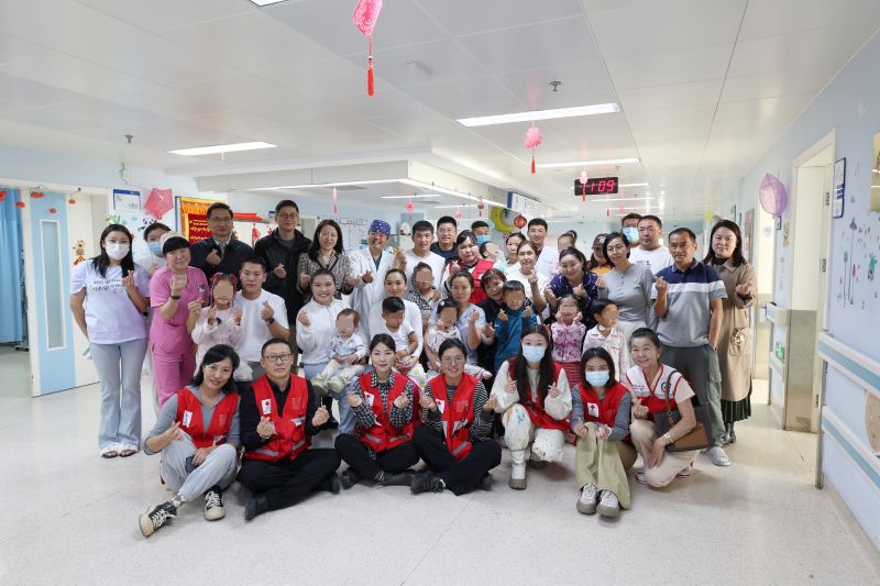 11月11日,蒙古国红十字会副秘书长巴雅尔其木格、中国红十字会总会联络部部长米娜、中国红十字基金会理事长贝晓超前往首都医科大学附属北京安贞医院探望正在接受治疗的14名蒙古国先心病患儿。图为即将出院的孩子与医护人员、红十字工作者开心合影。