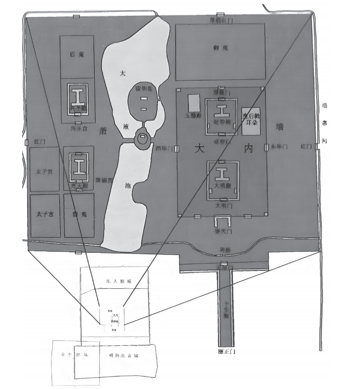 明的北京城是在元大都城的基础上发展起来的,不仅城址的位置未变,大城、皇城、宫城三城相套的格局也丝毫未变。明朝初年把原来的元大都北城墙向后撤了五里,缩回到今德胜门、安定门一线,明成祖年间又将元大都南城垣向南推进了二里,延伸到今宣武门、正阳门、崇文门一线。这样一盈一缩,导致明皇城也发生了些许变化。明末清初孙承泽《春明梦余录》云:“至永乐十五年改建皇城于东,去旧宫可一里许。”向东仅位移了一里许,足见明皇城基本还是在元皇城的位置上,发生的变化微乎其微。