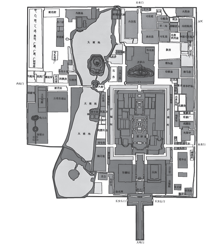 明初承袭南京之制,把北京的宫城和禁垣统称“皇城”。明神宗万历朝重修《大明会典》,把宫城改称“紫禁城”,把禁垣称为“皇城”,这样才把二者区分开。在皇城的位置稍稍向南和东作了偏移后,不可移动的太液池当然就从元皇城的正中心,微微向西做了位移,变成了与紫禁城并列于明皇城的正中间。但仍然保持未变的是,琼华岛依旧处在整个明皇城的核心部位。
