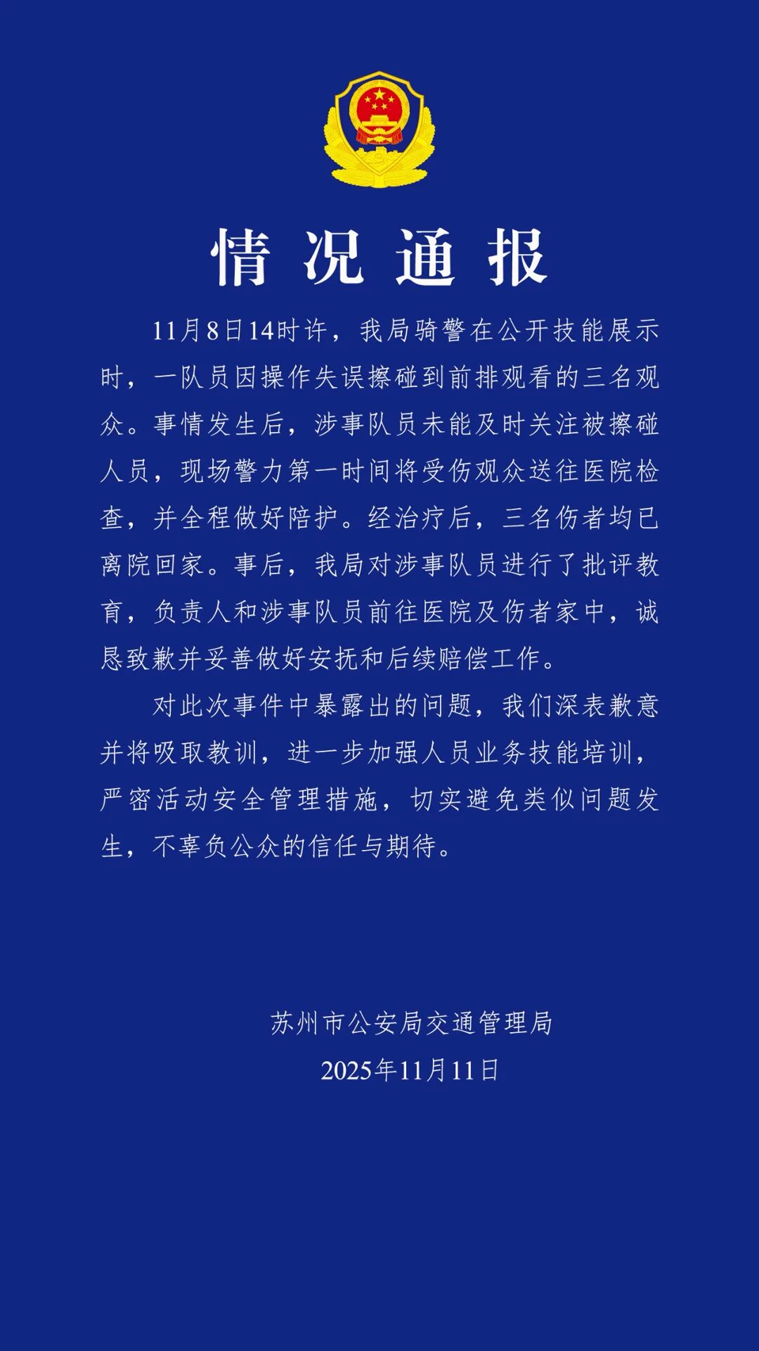 骑警在公开技能展示时操作失误擦碰3名观众 苏州通报