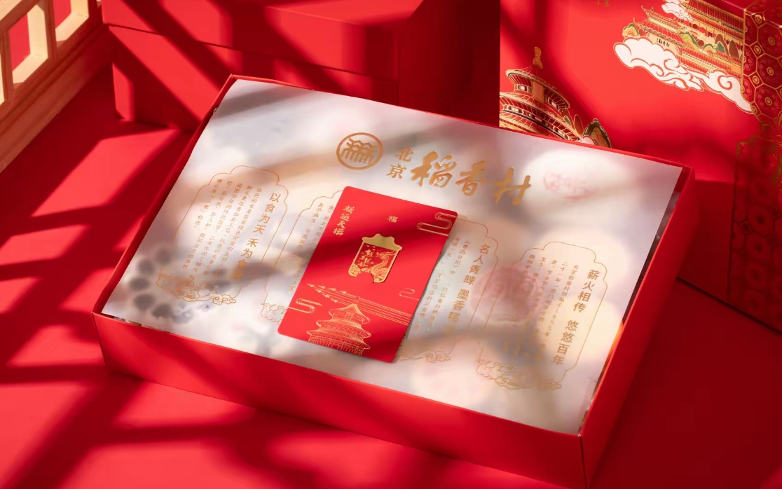 为了做好联名金贴,从元素选择到设计定稿,北京稻香村相关团队前后改了几十版,光设计师就轮换了好几拨。礼盒包装不能过于花哨,要符合北京稻香村的经典调性。糕点精选北京稻香村 “京八件” 中的福饼作为核心单品,紧扣“祈福”主题;考虑到不同消费群体的需求,礼盒中还纳入了糖醇糕点,适配老年人、控糖人群等特殊需求。