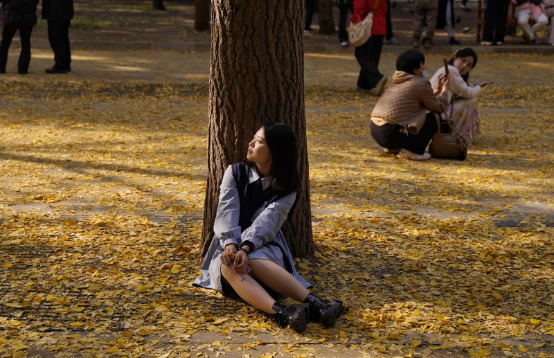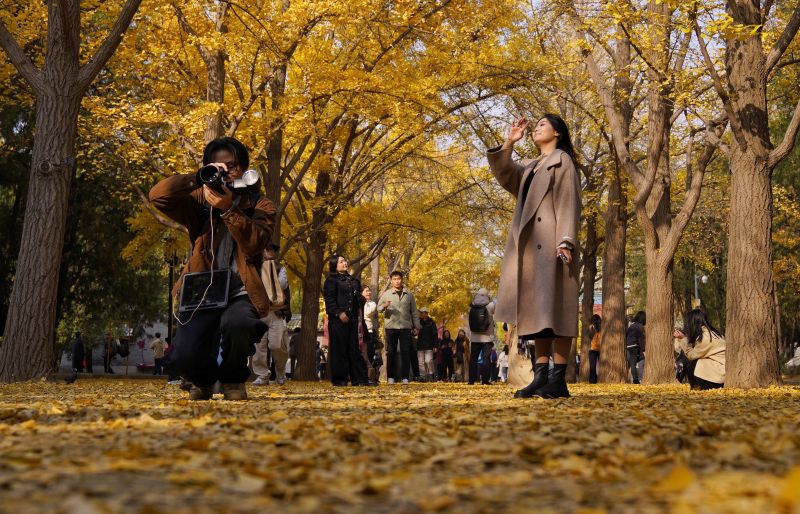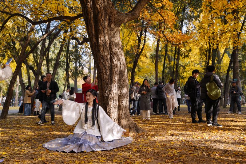 11月12日,地坛公园,一棵元宝枫下,古装游客拍照打卡。为了让秋日的专属浪漫多延续几天,北京多家公园实施“落叶缓扫”措施,为游客最大限度保留最美秋色。