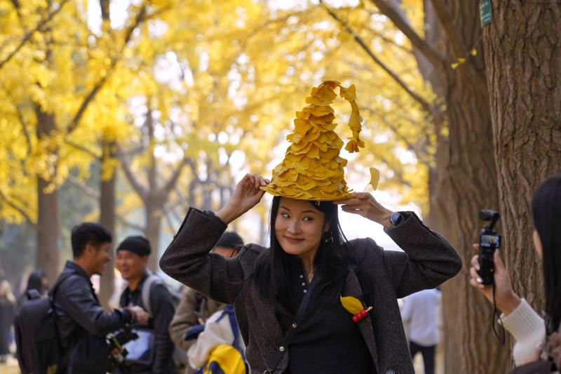 一位女孩戴着银杏树叶做的帽子留影。