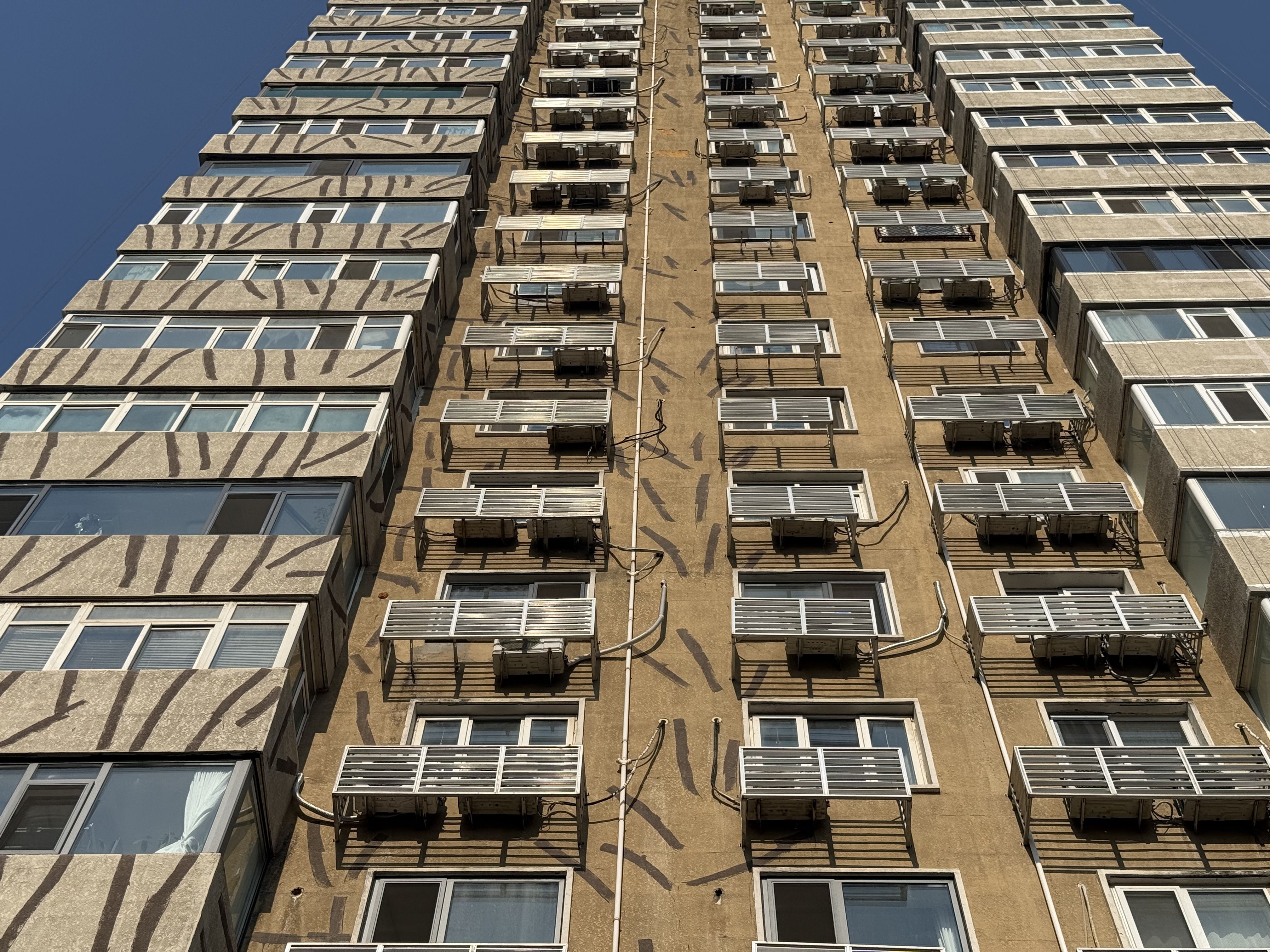 稻香园北社区7号楼外墙打了密密麻麻的深色“补丁”。新京报记者 曹晶瑞 摄