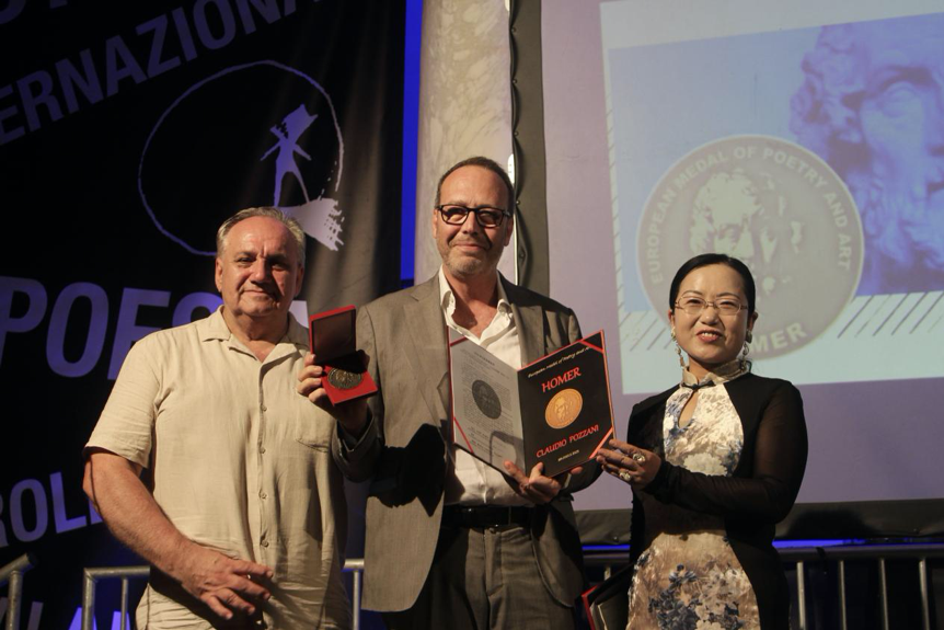欧洲诗歌暨文艺荷马奖章主席大流士和第一副主席赵四为克劳迪奥·波扎尼颁奖。