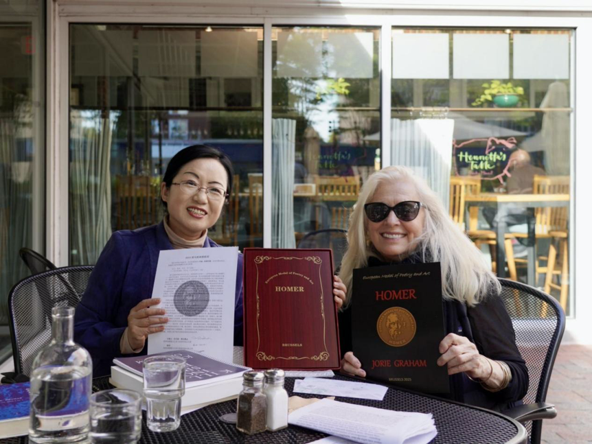 欧洲诗歌暨文艺荷马奖章第一副主席赵四与乔瑞·格雷厄姆会面于波士顿剑桥亨利埃塔餐厅。