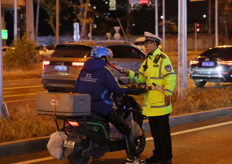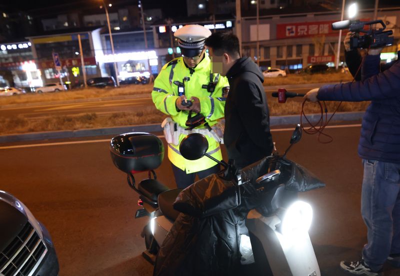 11月12日夜,一名饮酒后骑行电动自行车的市民接受交警的安全教育。“虽然您这次没有达到80mg/100ml的醉驾处罚标准,但饮酒时骑行非机动车还是有安全隐患,需要对您进行警告提醒,登记下信息,另外您今天最好就推着车步行回去,或者选择其他安全的交通方式。”朝阳交通支队机场大队副大队长高浩轩向这位市民介绍了法规的要求,如果达到了醉驾骑行非机动车的情节,则需要面临50元的罚款。