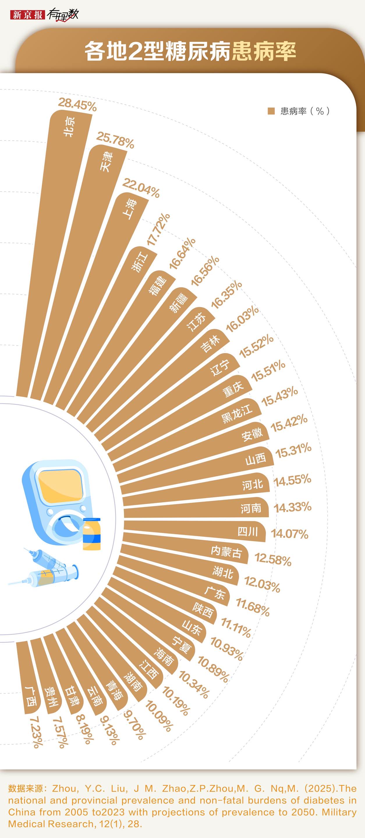 北京、天津的糖尿病患病率超20%,包揽前两名,西藏、广西、贵州等地患病率均低于10%。