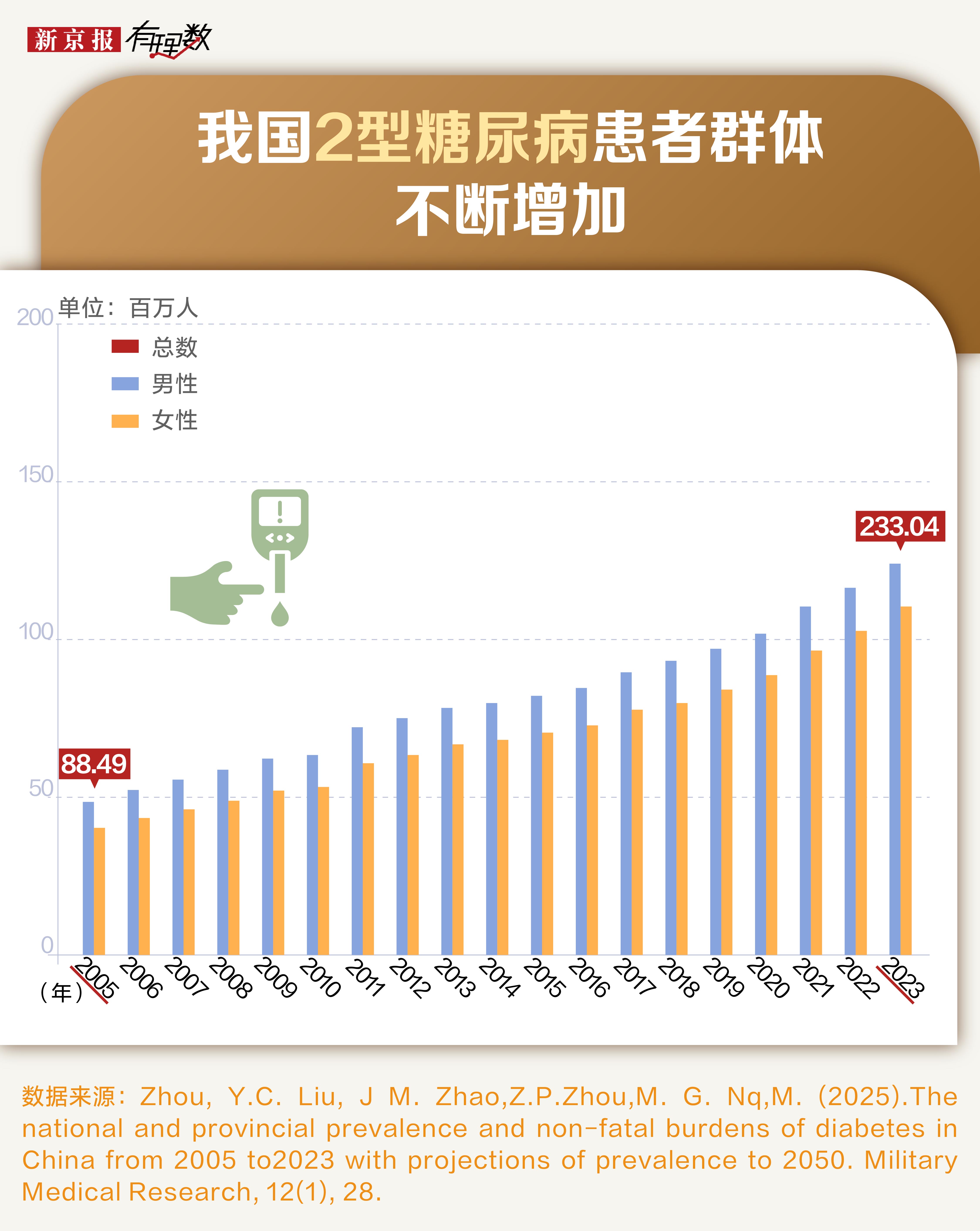 中国疾控中心的一项研究显示,2023年我国有2.33亿人患有糖尿病,较2005年(8848万)增长163%,占全球糖尿病人口的1/4。患病率为15.88%,差不多每6个人中,至少有1个人是糖友。