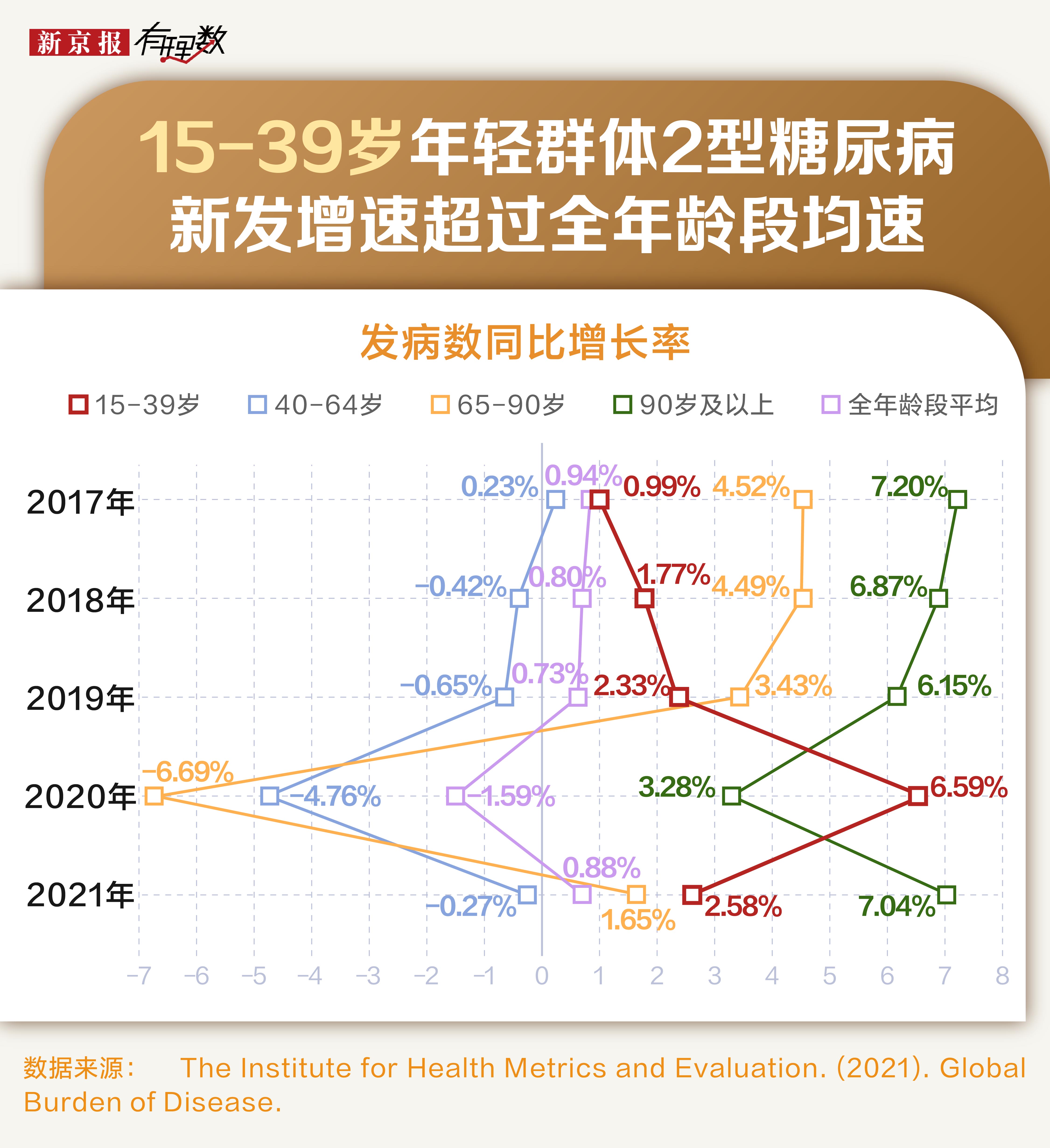 现在更令人担忧的是,这项专挑中老年发福人士的疾病,逐渐渗透到年轻人的生活中。全球疾病负担(GBD)数据显示,从2017-2021年,我国15-39岁2型糖尿病新发病例同比增长率,持续超过全年龄段整体增速。