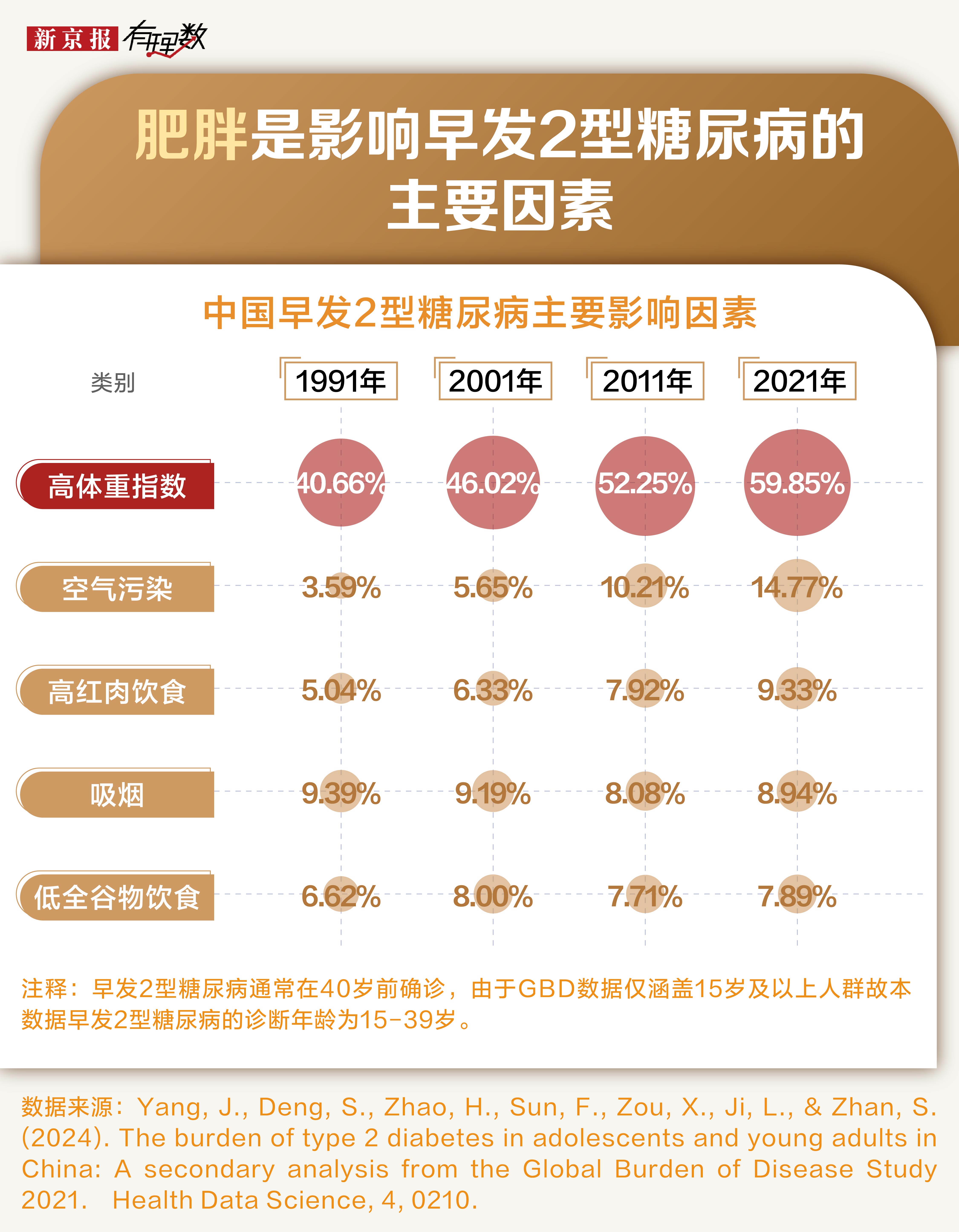 北京朝阳医院内分泌科主任王广教授认为,我国2型糖尿病发病呈现年轻化趋势,早发2型糖尿病数量的增加,更多与胰岛素抵抗有关。胰岛素抵抗则与肥胖关系密切。