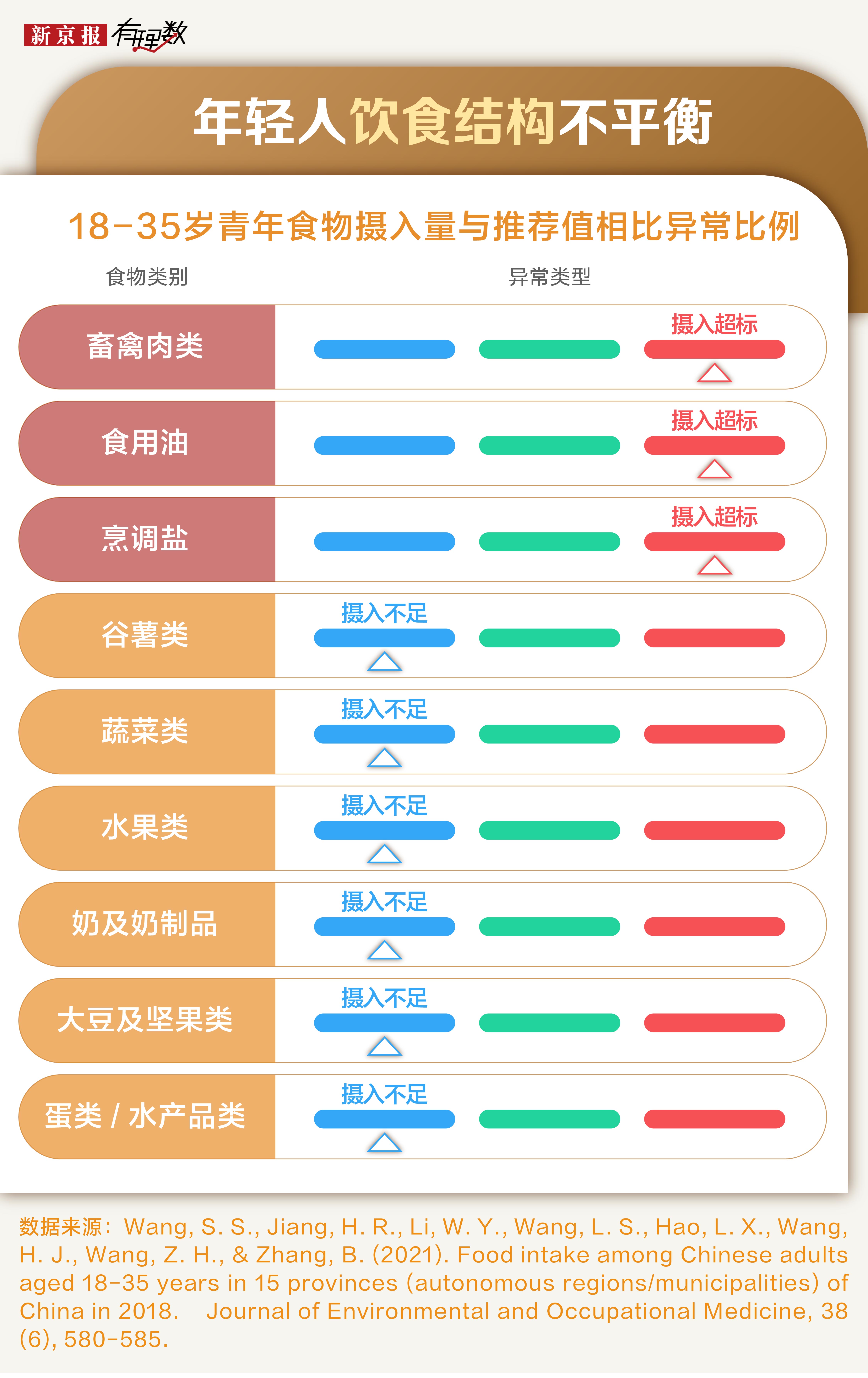 国人对肉类的喜爱由来已久,不少人更是“无肉不欢”,重口味的烹饪方式,增加了脂肪和热量的摄入。与之相对的是,年轻人对水果、谷物、蔬菜、奶制品、大豆等人体必需的营养素,摄入却普遍不足。