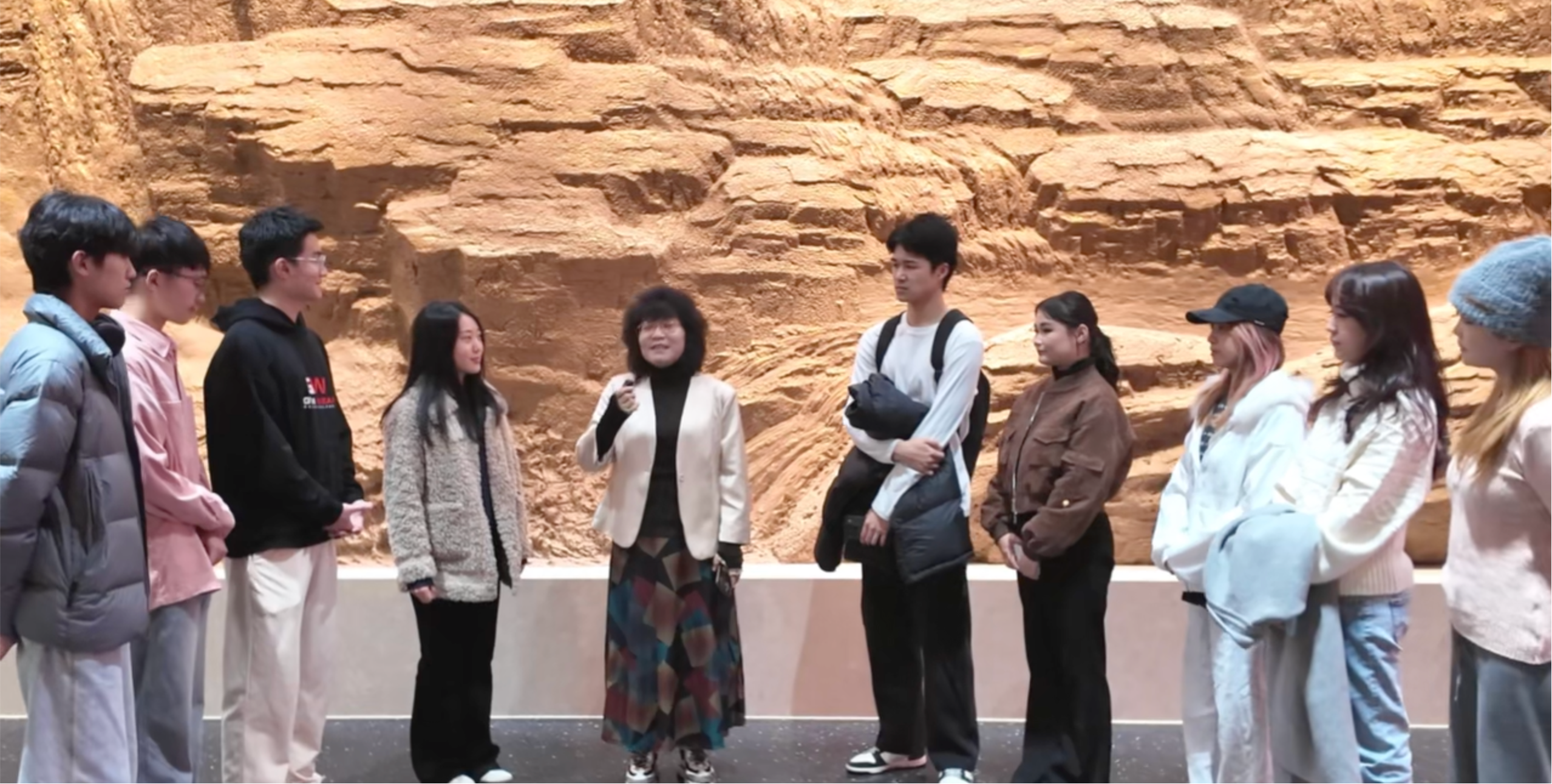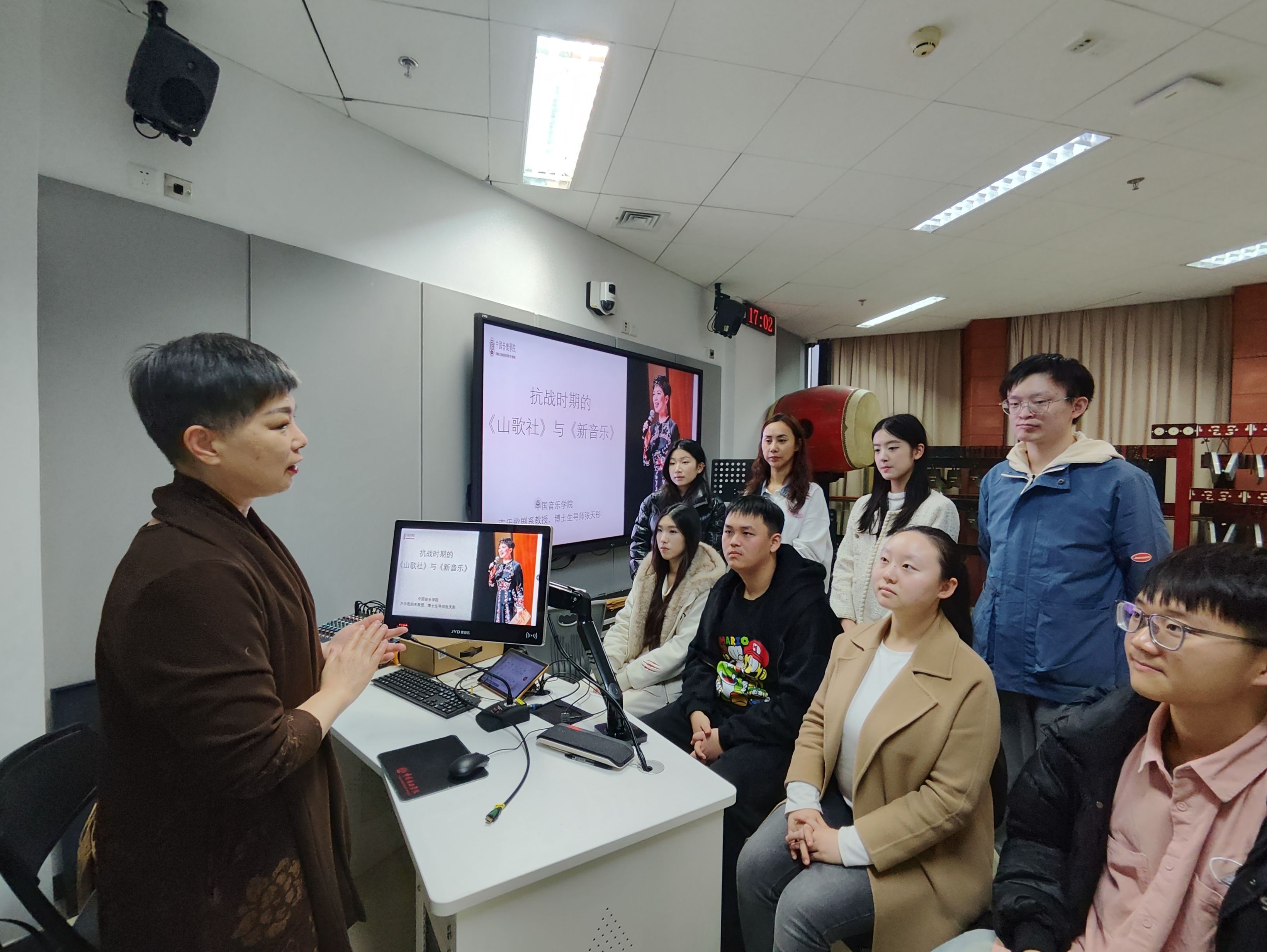 在参观抗战馆的过程中,李先灵教导同学们:“‘天下兴亡、匹夫有责’的爱国情怀,‘视死如归、宁死不屈’的民族气节,‘不畏强暴、血战到底’的英雄气概,‘百折不挠、坚韧不拔’的必胜信念,就是我们要弘扬的伟大抗战精神。”返校后,张天彤和李先灵围绕“抗战时期的《山歌社》与《新音乐》”主题,理论联系实际,带领同学们回顾历史,向同学们介绍了抗战时期以李凌为代表的音乐工作者为抗日民族统一战线作出的宝贵贡献,并鼓励新时代国音学子以民歌为载体,传承家国情怀。