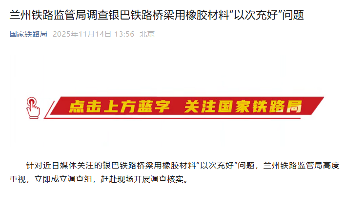 新京报讯 据国家铁路局微信公众号消息,针对近日媒体关注的银巴铁路桥梁用橡胶材料“以次充好”问题,兰州铁路监管局高度重视,立即成立调查组,赶赴现场开展调查核实。