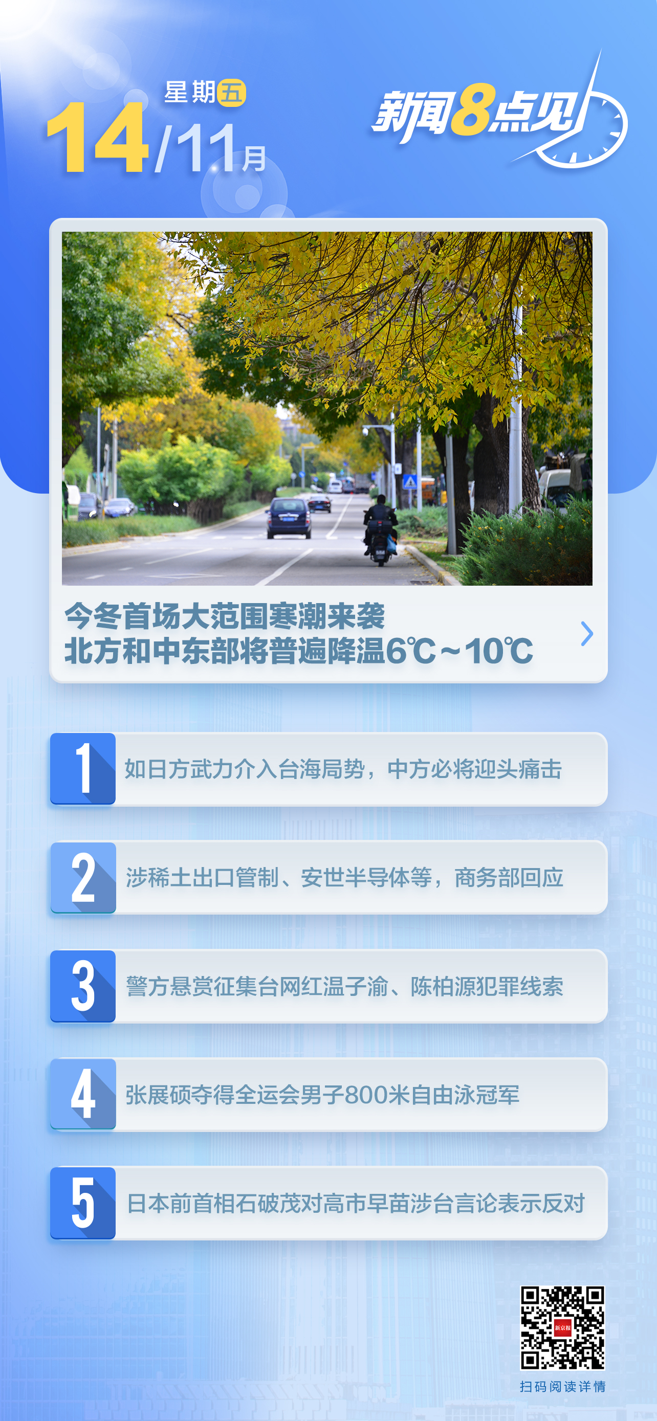 中央气象台预计,11月14-17日,我国北方和中东部地区将迎来下半年首次寒潮过程,14日冷空气主要影响西北地区和内蒙古中西部;15-17日,将影响中东部地区。此次寒潮过程中,部分地区降温幅度大、风力猛烈并伴有雨雪天气。中央气象台首席预报员马学款介绍,寒潮影响期间,北方和中东部大部地区气温将普遍下降6~10℃,局地降温12~14℃,长江中下游及其以北大部地区有4~6级偏北风,阵风7~8级。预计15-16日,甘肃东南部、陕西南部、黄淮西部、四川盆地有小到中雨,局地大雨,内蒙古东部和东北地区北部及西藏东部的部分地区有小到中雪或雨夹雪,局地大雪。(新京报)阅读全文>>>