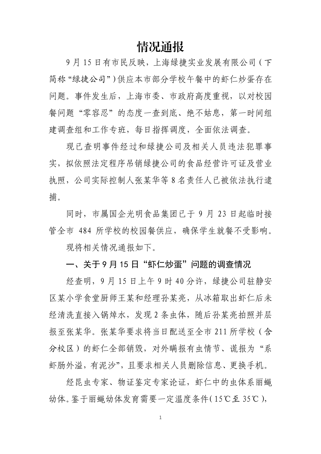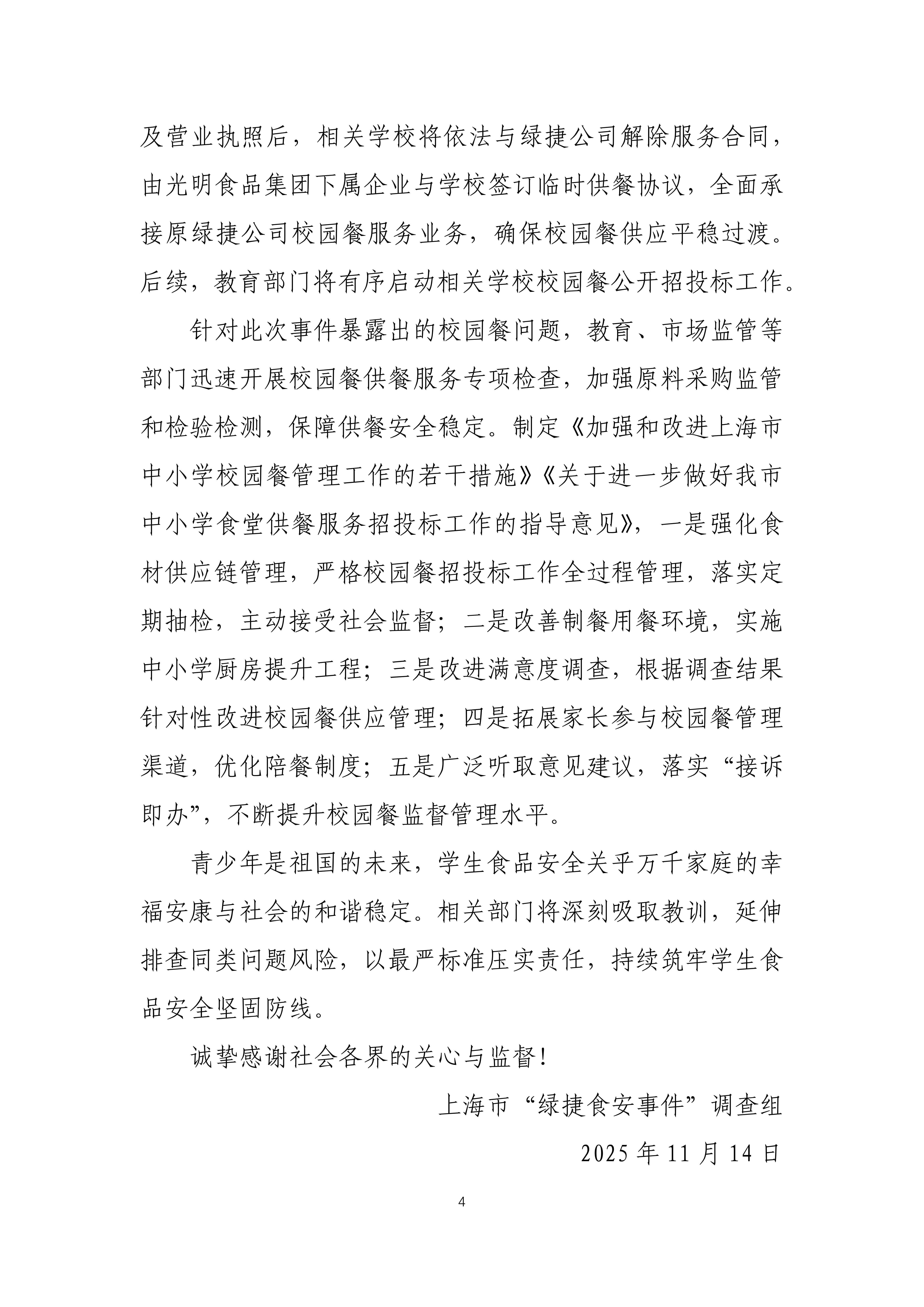 新京报讯 11月14日,上海市“绿捷食安事件”调查组发布情况通报,内容如下: