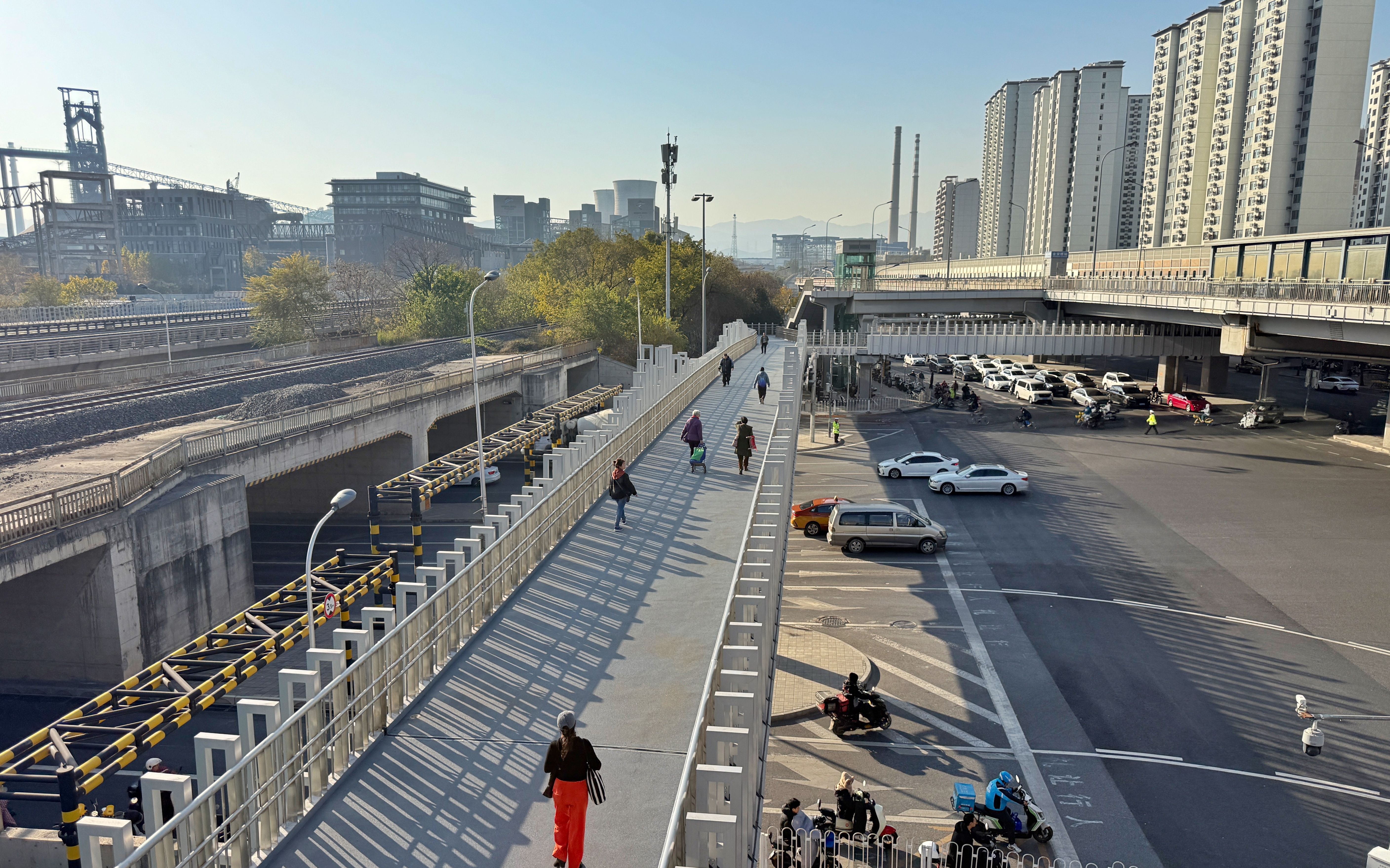 一座“口”字形的天桥将金安桥路口的各个方向连通,行人不再需要等候信号灯,就可以在环状天桥上行走。为了方便老年人、残障人士等群体出行,天桥还安装了缓坡、自动扶梯和无障碍直梯。通过建设“口”字形钢结构天桥,该区域实现了三维立体换乘,助力交通缓堵。
