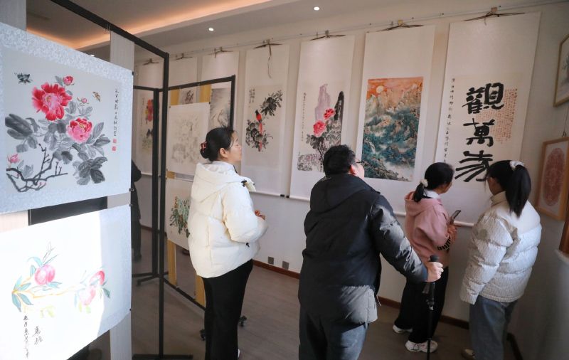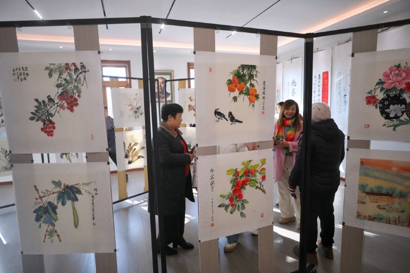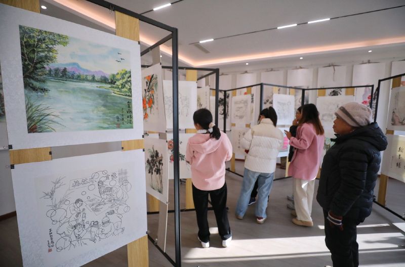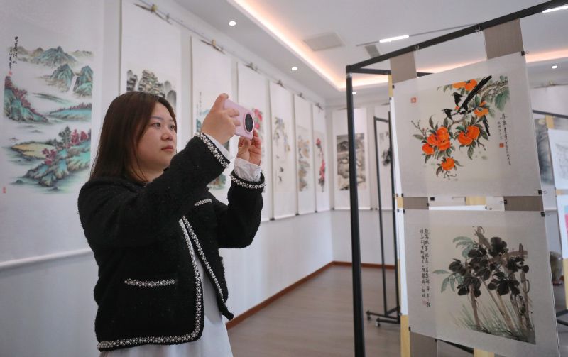 观众参观展览。本届书画展特邀一众书画名家深入乡村,聚焦乡村风貌、创新业态、环境治理、非遗民俗等进行采风创作,艺术家们以笔为媒、以墨传情,将美好乡村的蝶变与发展通过细腻笔触与独特视角,生动鲜活地呈现在一幅幅佳作之中。