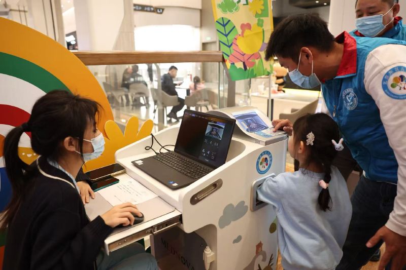 北京东区儿童医院工作人员为小朋友测骨龄。