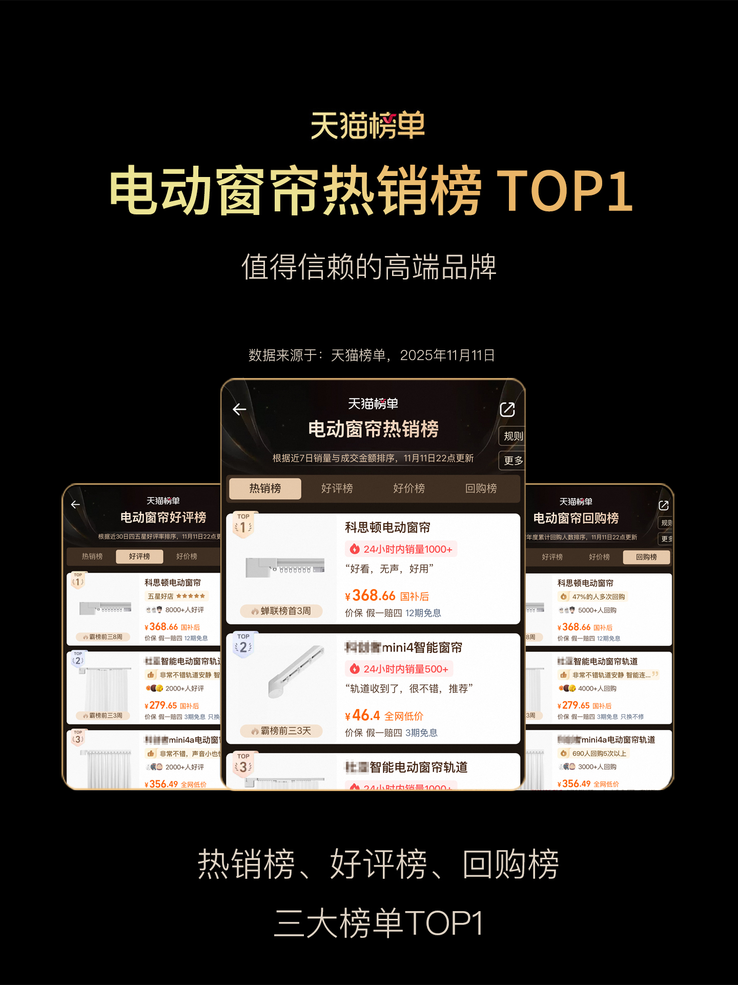 在2025年天猫双11购物节中,科思顿以绝对实力包揽热销榜、好评榜、回购榜三大榜单TOP1的辉煌战绩,进一步巩固了其在电动窗帘领域的领军地位。